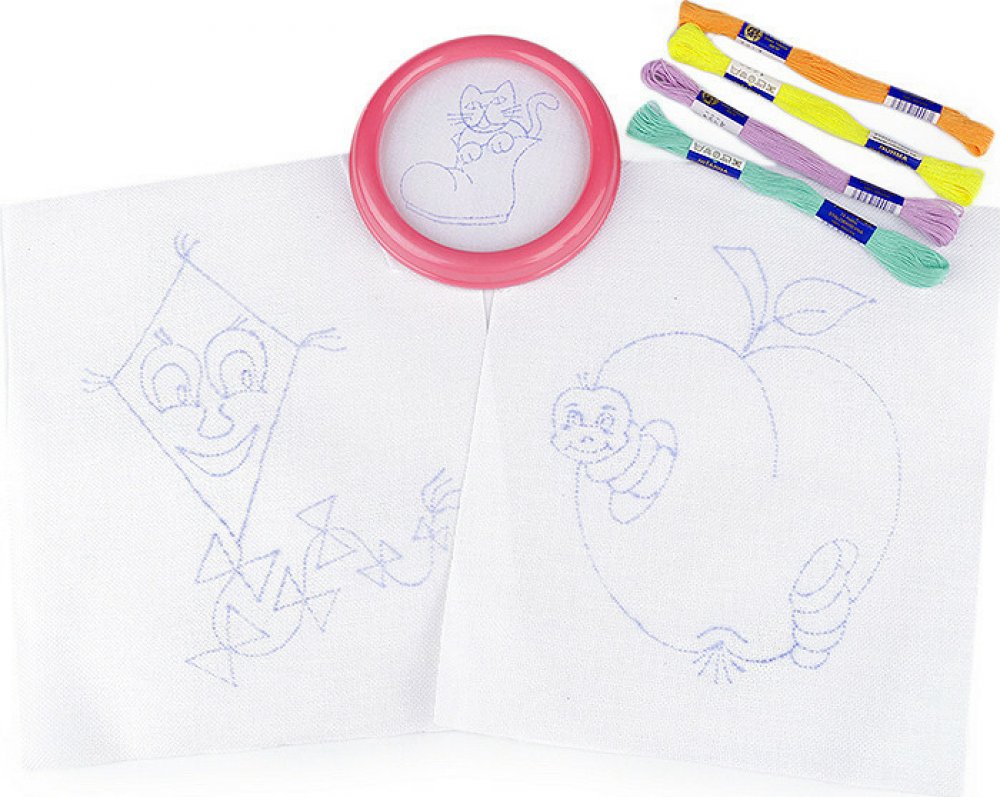 Zabavte vaše šikovné děti vyšíváním. Souprava dětského vyšívání obsahuje kulatý rámeček s látkou, která má předtištěný vzor, 4 kvalitní vyšívací příze mouline ze 100% bavlny a dvě větší plátna (23 x 26 cm) s předtištěnými motivy.