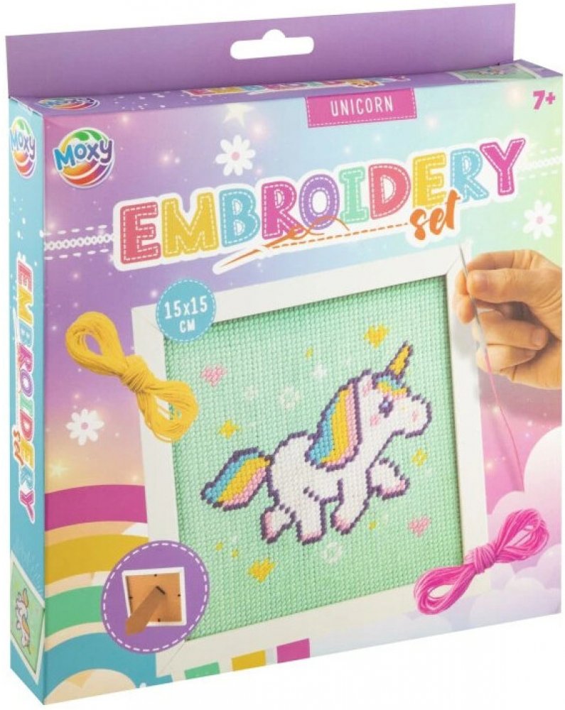 6 bavlnek, vyšívací kovovou jehlu s kulatým hrotem, bílý plastový rámeček se stojánkem 15 x 15 cm. Na zadní straně obaluje je obrázkový návod jak na vyšívání.