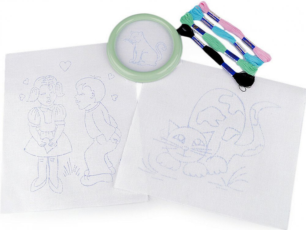 Zabavte vaše šikovné děti vyšíváním. Souprava dětského vyšívání obsahuje kulatý rámeček s látkou, která má předtištěný vzor, 4 kvalitní vyšívací příze mouline ze 100% bavlny a dvě větší plátna (23 x 26 cm) s předtištěnými motivy.