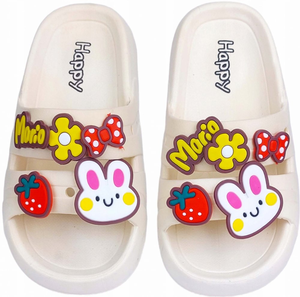 ROZTOMILÉ a pohodlné sandály se sladkými ozdobami, vyrobené z lehkého materiálu typu pěna. Ozdobné prvky: králík, mašle, květina, jahoda, nápis Mario. Další výhodou ozdob je možnost jejich vypnutí nebo přepnutí na jiné místo. Snadno se udržují v čistotě. Skvěle se hodí k bazénu, na pláž, pod sprchu a mohou také nahradit papuče.