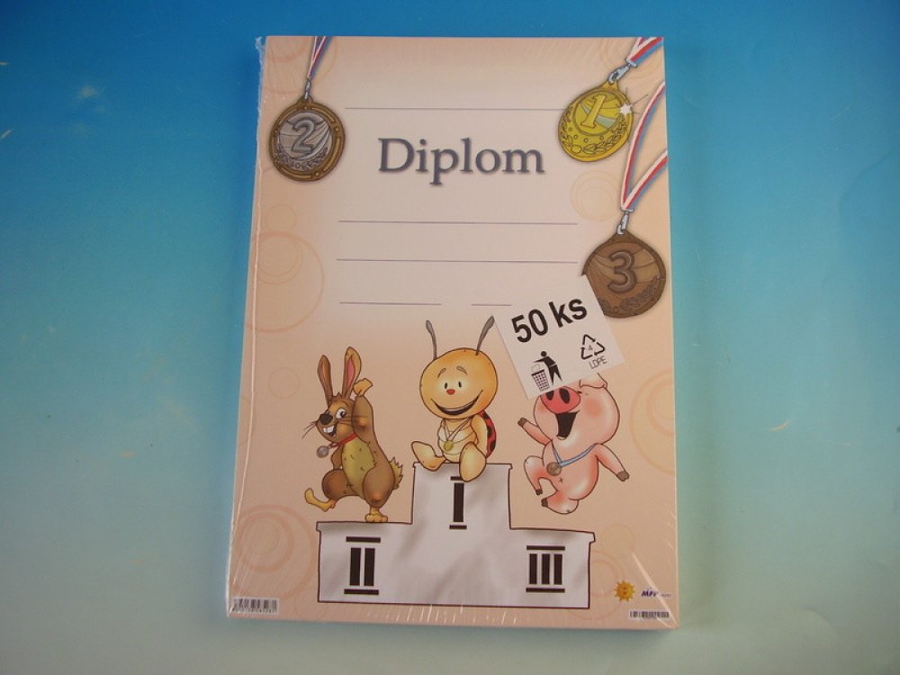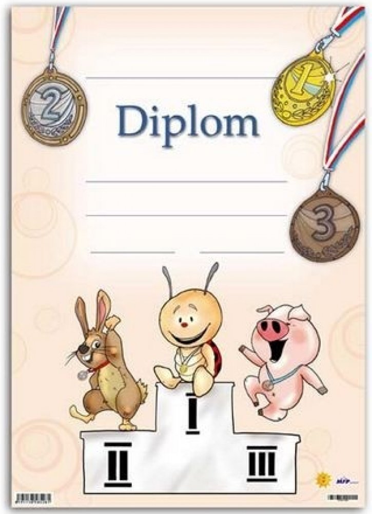 Barevný dětský diplom s obrázkem zvířátek - za každý dosažený úspěch je potřeba dostat písemnou listinu. Určený pro sportovní aktivity. Diplom obsahuje 4 řádky, do kterých můžete napsat jméno, umístění, za co diplom dostal, popřípadě kdo jej uděluje. Formát: A4 Gramáž: 300g Druh papíru: křídový, matný Uvedená cena je za 1 ks.