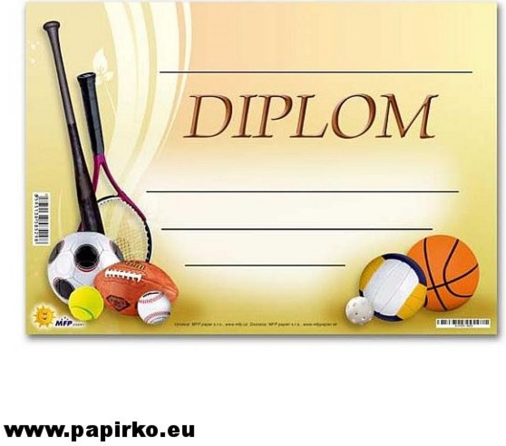 Barevný diplom s obrázkem míčů, rakety, pálky.