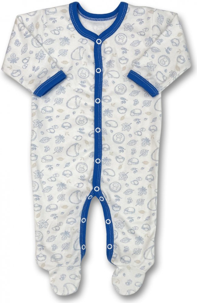 overálek je vyroben z příjemné jemné bavlny ideální pro miminka, zapínání uprostřed na baby druky - usnadňuje pohodlné oblékání i přebalování novorozených miminek - není nutné přetahovat přes hlavičku. Overal zdobí obrázky ježečků, lemování modré.