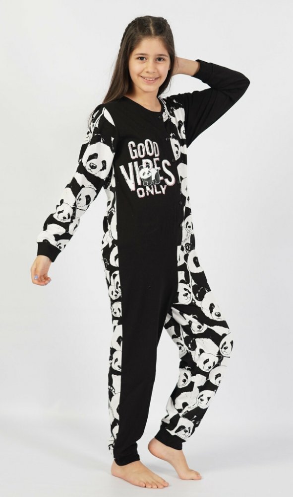 Dětský overal na spaní Panda, s rozepínaním na knoflíky. Vepředu je jedna část jednobarevná, s nápisem: Good vibes only, druhá potištěná pandami. Jednobarevný je i protilehlý rukáv. Vzadu je overal celý potištěný pandami. Rukávy a kalhoty jsou zakončeny pružnými patenty.