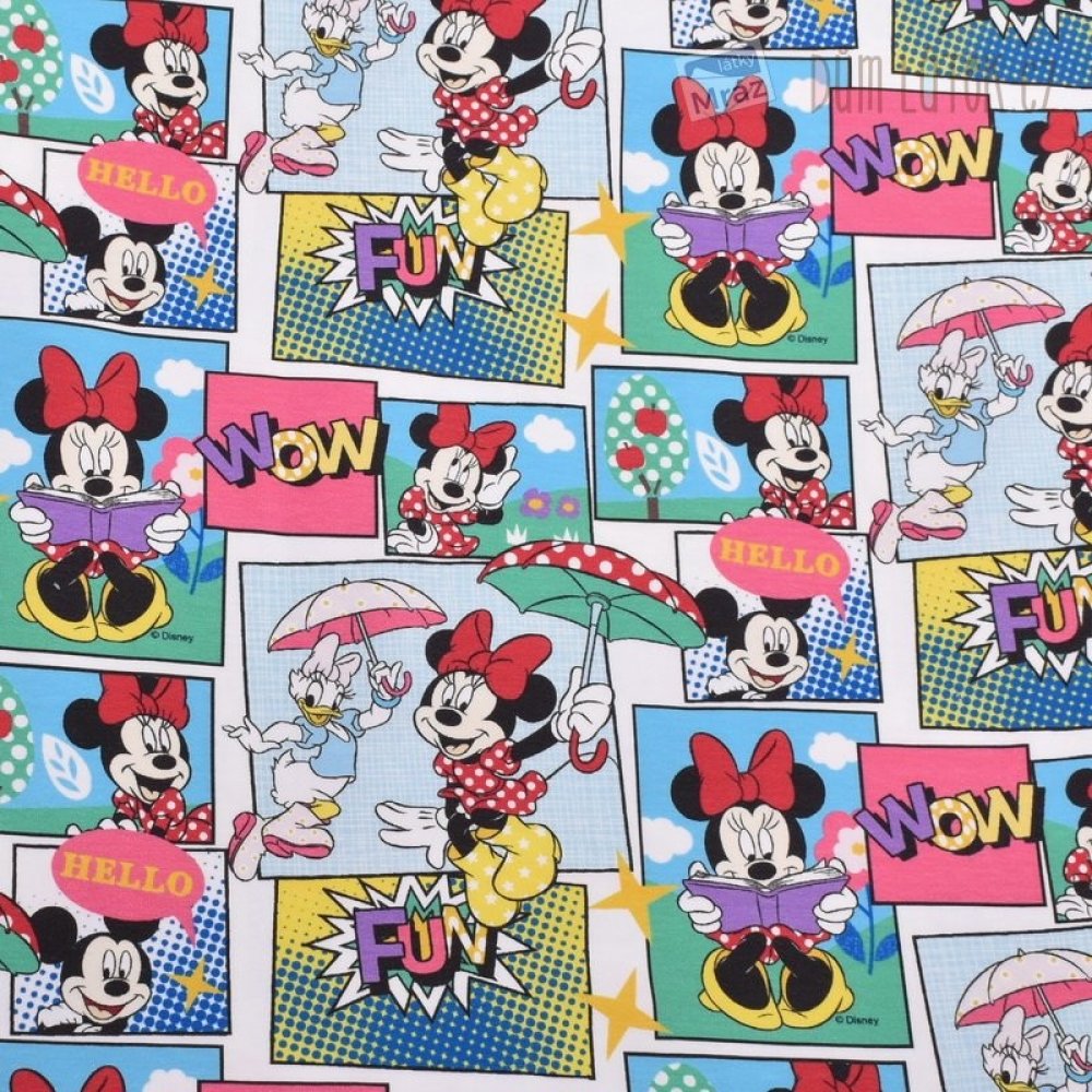 Krásný a příjemný bavlněný úplet s digitálním postiskem oblíbené pohádky Mickey Mouse. Látka je hladká a poddajná,tudíž se s ní snadno pracuje.