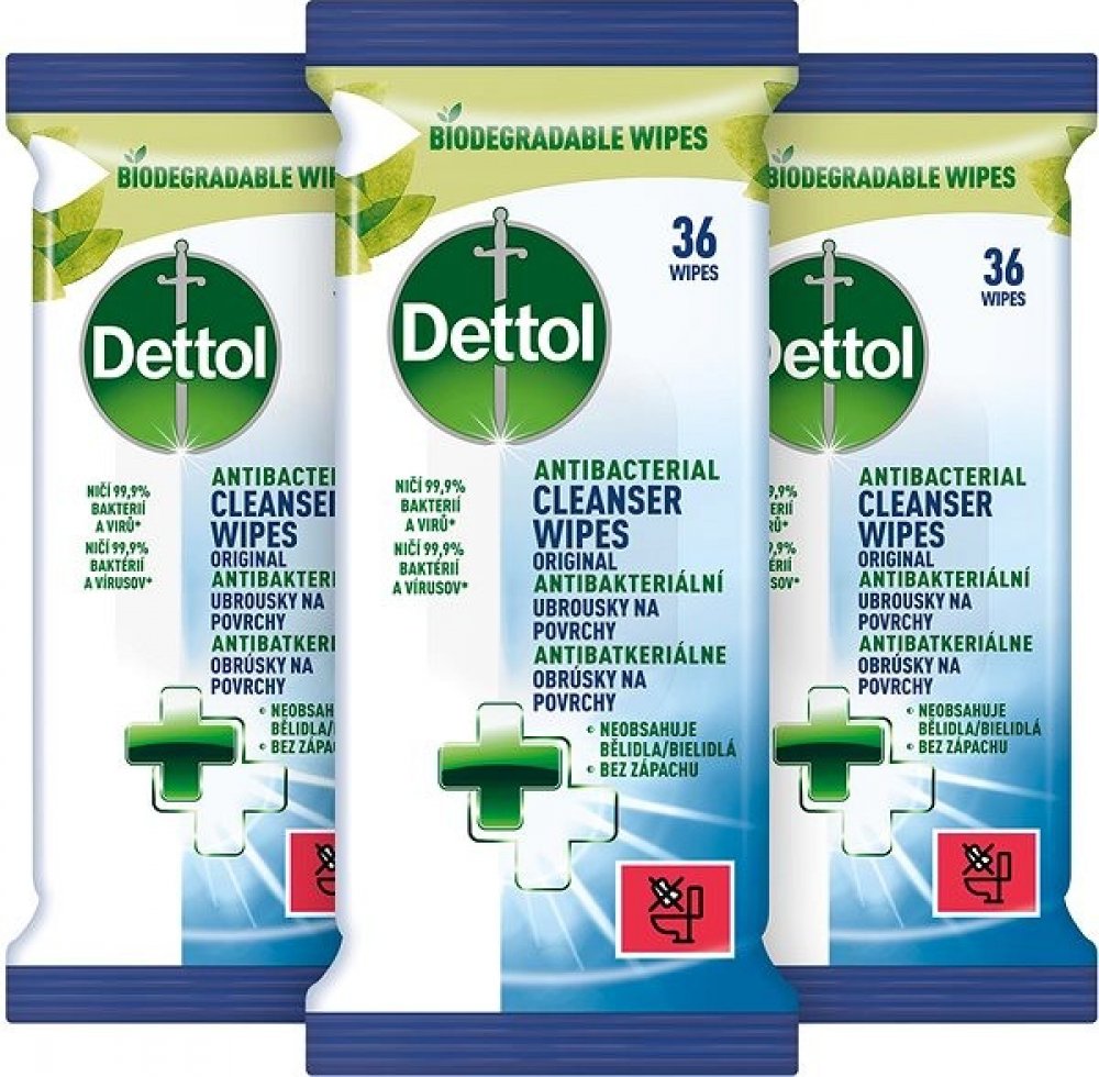 Antibakteriální ubrousky DETTOL vám dokonale usnadní úklid povrchů. Ničí 99,9 % bakterií a specifických virů, mezi něž patří respirační syncytiální virus, chřipka typu A, lidský koronavirus i SARS-CoV-2. Současně odstraňují až 90 % alergenů, jako je prach, kočičí a psí srst i pyl, které jsou přítomné na tvrdém povrchu. Ubrousky neobsahují bělidla ani barviva a lze je používat na povrchy, které přicházejí do kontaktu s potravinami, na klávesnice, dětské židle, dřezy i odpadkové koše. V dodávce najdete 3 balení ubrousků DETTOL po 36 ubrouscích. Klíčové vlastnosti antibakteriálních ubrousků na povrchy DETTOL, 3 × 36 ksAntibakteriální ubrousky určené na úklid povrchůNičí 99,9 % bakterií a specifických virůOdstraňují až 90 % alergenů, jako je prach, kočičí a psí srst i pylUbrousky DETTOL neobsahují bělidla ani barvivaLze je používat na povrchy, které přicházejí do kontaktu s potravinamiVhodné na klávesnice, dětské židle, dřezy i odpadkové koše