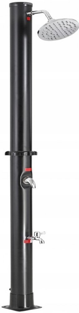 Jednoduché připojení zahradní hadice a můžeme začít používat solární sprchu. Díky chromované termostatické baterii lze nastavit teplotu vody. Je zde také možnost koupání ve studené vodě. Ve výšce 52 cm je namontován kohoutek s přívodem studené vody, který je užitečný při zahradních pracích. Masivní kovová základna zaručuje bezpečné a stabilní používání. Tento sprchový kout je vyroben z plastu odolného vůči UV záření a lze jej tedy demontovat, takže je jednoduchý a snadno se přepravuje. NOVINKA – s vypouštěcí zátkou pro rychlé vyprázdnění sprchy z vody