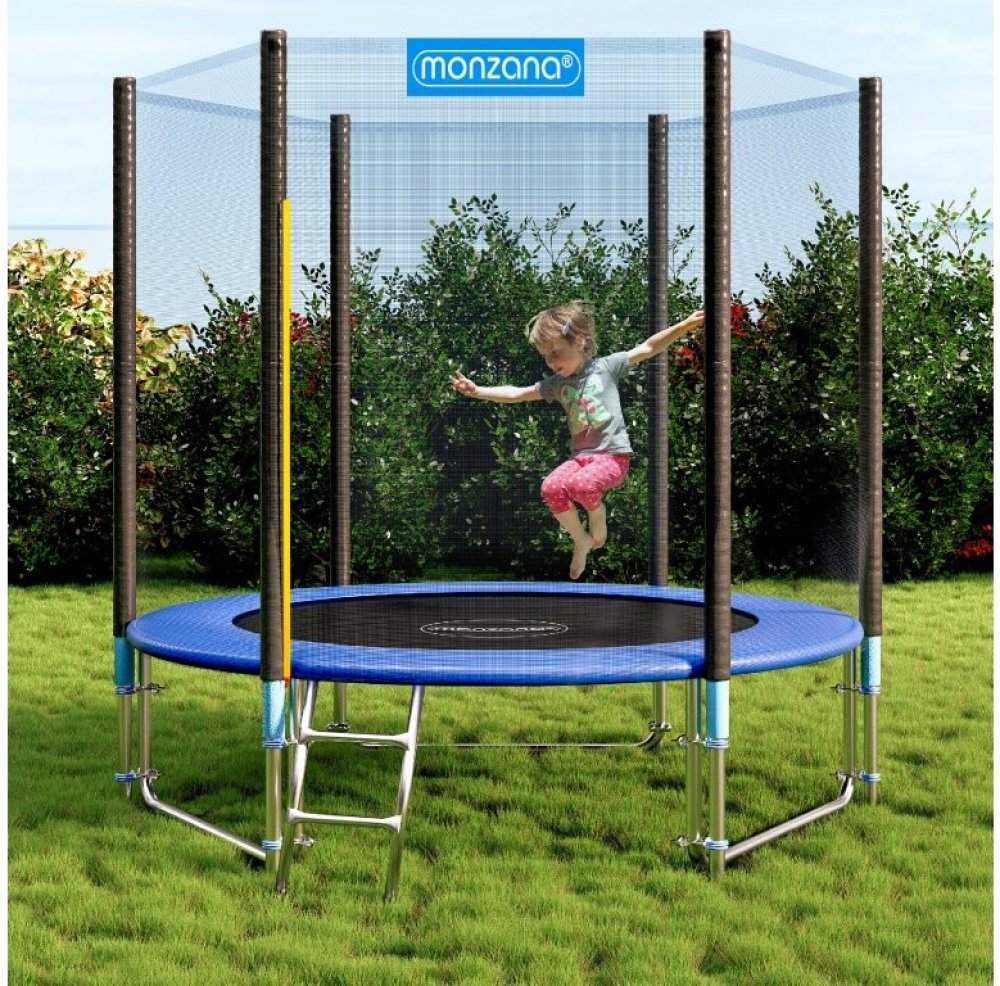 Kvalitní zahradní trampolína je speciálně navržena pro venkovní použití. Při skákání lze trénovat a zdokonalovat koordinaci, pohyblivost a ovládání těla. Vnitřní bezpečnostní síť s úzkými oky nabízí vysokou úroveň bezpečnosti díky svému revolučnímu designu. Tím se zabrání kontaktu s kovovými pružinami ocelového rámu. Síť je obzvlášť odolná proti roztržení a povětrnostním vlivům. Podélné sloupy, které sahají až k podlaze, jsou několikrát upevněny, což vede ke zvýšení stability a tím i větší bezpečnosti. Vstup je zajištěn pevně instalovaným dvouklikovým zámkem. Materiál vnitřní podložky na skákání je vyroben z kvalitního PP materiálu odolného vůči UV záření. Díky extra stabilní konstrukci lze trampolínu zatížit maximálně 150 kg. Všechny komponenty trampolíny jsou odolné vůči vodě a povětrnostním vlivům. Trampolína je obzvláště stabilní díky nohám ve tvaru W. Pro usnadnění montáže dostanete pružinový napínák a vstupní žebřík.
