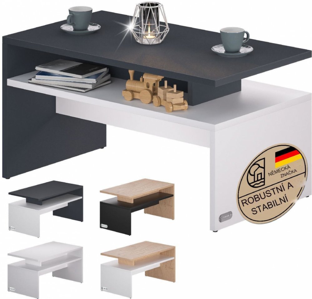 Konferenční stolek Sacramento s rovným, puristickým designem chytře uspořádá vaše bytové doplňky. Díky druhé úrovni máte po ruce vše, co potřebujete pro pohodlný večer. Stolek se přizpůsobí různým tvarům pohovky. Povrchová vrstva odolná vůči poškrábání je voděodpudivá a snadno se čistí. Konstrukce plochých nohou stolu jej činí obzvláště stabilním a může být zatížen až 50 kg.