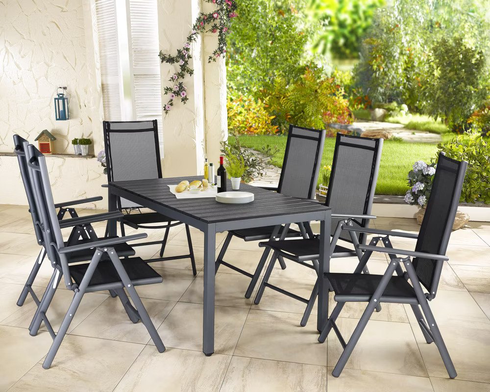 Elegantní zahradní sestava s hliníkovým rámem ve stylové antracitové barvě, obsahuje velkorysý stůl doplněný o WPC stolovou desku a šest skládacích křesel s možností nastavení opěradla do 7 různých poloh. Nohy stolu jsou vybaveny stavěcími šrouby, které umožňují stabilní umístění i na nerovném povrchu. Potahy křesel jsou z textilní syntetické tkaniny odolné vůči povětrnostním vlivům, nenáročné na údržbu a snadno omyvatelné. Na rozdíl od běžného zahradního nábytku jsou všechny konstrukční prvky, včetně trubek, vzpěr a dokonce i šroubů, vyrobeny z hliníku a nerezavějící oceli. Tento materiál zaručuje mimořádnou odolnost vůči nepříznivému počasí a dlouhou životnost.