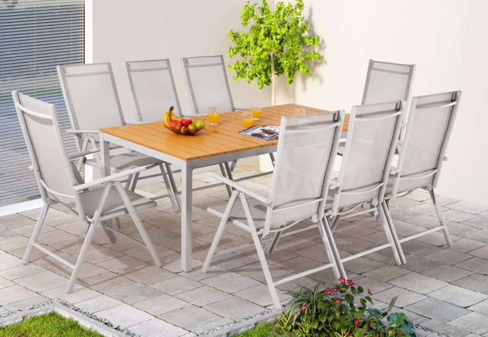 Elegantní zahradní sestava s hliníkovým rámem ve stylové antracitové barvě, obsahuje velkorysý stůl doplněný o WPC stolovou desku a osm skládacích křesel s možností nastavení opěradla do 7 různých poloh. Nohy stolu jsou vybaveny stavěcími šrouby, které umožňují stabilní umístění i na nerovném povrchu. Potahy křesel jsou z textilní syntetické tkaniny odolné vůči povětrnostním vlivům, nenáročné na údržbu a snadno omyvatelné. Na rozdíl od běžného zahradního nábytku jsou všechny konstrukční prvky, včetně trubek, vzpěr a dokonce i šroubů, vyrobeny z hliníku a nerezavějící oceli. Tento materiál zaručuje mimořádnou odolnost vůči nepříznivému počasí a dlouhou životnost.