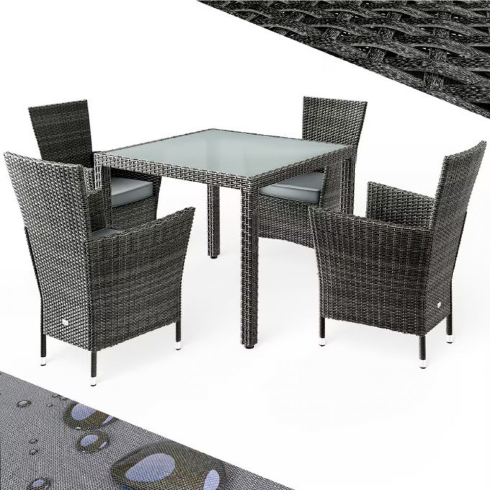 Sestava ideální na zahradní párty a grilovačkyZahradní sestava z ručně tkaného polyratanu, která je odolná vůči povětrnostním vlivům, zahrnuje stůl a čtyři pohodlná zahradní křesla, která jsou ideální pro útulné letní večery a grilovací párty v zahradě, na terase nebo balkoně. Měkké podsedáky zajišťují pohodlné sezení, které lze prát na 30 °C. Křesla o výšce sedáku 43 cm jsou pevná a unesou až 160 kg, přičemž se dají jednoduše stohovat pro úsporu místa. Stolní deska z 5 mm silného matného skla dodává sestavě elegantní vzhled.Výhody produktu:5-dílná sedací soupravaElegantní dizajnVysoký komfort sezeníStohovatelná křeslaVysoká odolnostOdolný vůči povětrnostním vlivům a UV zářeníSnadno udržovatelný podsedák se zipemPotah lze prát na 30°CNohy na stole a křeslech jsou výškově nastavitelnéTechnické specifikace:Rozměry stolu (DxŠxV): 90 x 90 x 75 cmNosnost stolu: 80 kgMateriál desky stolu: 5 mm silné bezpečnostní skloMateriál konstrukce: ocel s práškovým nástřikemMateriál čalounění: 100% polyesterRozměry křesla (DxŠxV): 59 x 59 x 88 cmNosnost křesla: 160 kgMateriál výpletu: polyratanBarva výpletu: šedáVýška bez podsedáku: 43 cmTloušťka podsedáku: 7 cmBarva podsedáku: antracitRozsah doručení:1 x stůl4 x křesla4 x podsedáky