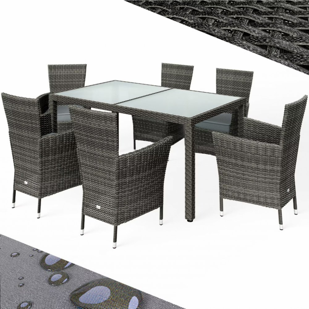 Sestava ideální na zahradní párty a grilovačkyZahradní sestava z ručně tkaného polyratanu, který je odolný vůči povětrnostním vlivům, zahrnuje stůl a šest pohodlných zahradních křesel, která jsou ideální pro útulné letní večery a grilovací párty v zahradě, na terase nebo balkoně. Měkké podsedáky zajišťují pohodlné sezení, které lze prát na 30 °C. Křesla o výšce sedáku 43 cm jsou pevná a unesou až 160 kg, přičemž se dají jednoduše stohovat pro úsporu místa. Stolní deska z 5 mm silného matného skla dodává sestavě elegantní vzhled.Výhody produktu:7-dílná sedací soupravaElegantní designVysoký komfort sezeníStohovatelná křeslaVysoká odolnostOdolný vůči povětrnostním vlivům a UV zářeníSnadno udržovatelný podsedák se zipemPotah lze prát na 30°CNohy na stole a křeslech jsou výškově nastavitelnéTechnické specifikace:Rozměry stolu (DxŠxV): 150 x 90 x 75 cmNosnost stolu: 80 kgMateriál desky stolu: 5 mm silné bezpečnostní skloMateriál konstrukce: ocel s práškovým nástřikemMateriál čalounění: 100% polyesterRozměry křesla (DxŠxV): 59 x 59 x 88 cmNosnost křesla: 160 kgMateriál výpletu: polyratanBarva výpletu: šedáVýška bez podsedáku: 43 cmTloušťka podsedáku: 7 cmBarva podsedáku: antracitRozsah doručení:1 x stůl6 x křesla6 x podsedáky