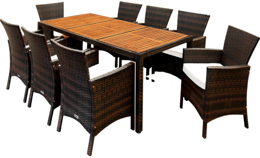 Sestava pro pohodlné chvíle na zahradě, terase či balkoněS exkluzivní zahradní sestavou si užijete pohodlí a moderní vzhled. Kombinace masivního akáciového stolu a osmi prostorných křesel vytváří ideální místo pro společné chvíle s rodinou i přáteli.Stůl o rozměrech 190x90x75 cm nabízí dostatek prostoru pro servírování a jeho pevná dřevěná deska působí elegantně a přirozeně. Křesla se 7 cm silnými podsedáky zajišťují maximální komfort, potahy lze jednoduše prát při 30 °C. Díky nosnosti 160 kg a extra širokému sedadlu s opěrkami poskytují stabilitu i při delším sezení.Polyratan je odolný vůči UV záření a povětrnostním vlivům a spolu s kvalitním akáciovým dřevem garantují dlouhou životnost a snadnou údržbu. Nadčasový dizajn stolu a křesel se hodí do každé zahrady, na terasu i balkon a vytvoří příjemnou atmosféru pro každodenní posezení.Výhody produktu:Elegantní designVysoký komfort sezeníExtra široká křeslaStolová deska z akáciového dřevaRučně tkaný polyratanOdolný vůči povětrnostním vlivůmOdolný vůči UV zářeníSnadno se čistíPratelné potahy na zipVýškově nastavitelné nohyTechnické specifikace:Rozměry stolu (DxŠxV): 190 x 90 x 75 cmRozměry židle (VxŠxH): 90 x 56 x 60 cmVýška sedáku včetně polštářů: 50 cmVýška loketní opěrky: 67 cmMateriál stolové desky: akáciové dřevoMateriál konstrukce: pozinkovaná ocel s práškovou barvouMateriál podsedáku: 100% polyesterMateriál výpletu: polyratanNosnost na stůl/křesla: 160 kgBarva výpletu: hnědáBarva podsedáku: krémováRozsah doručení:1 x stůl8 x křeslo8 x podsedák