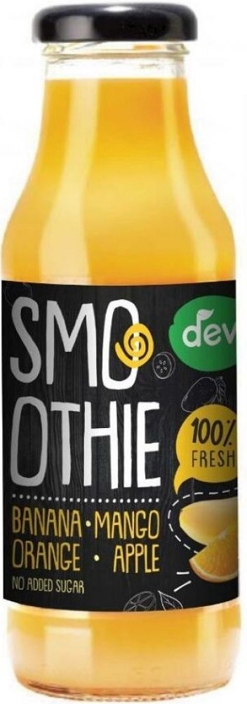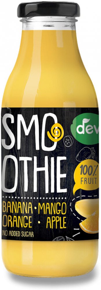 Ovocné smoothie z jablek s banánovým a mangovým pyré s přídavkem pomerančové šťávy. Vyrobené s láskou a bez konzervantů. Deva smoothie je vyrobeno z nejkvalitnějšího ovoce s ohledem na šetrné zemědělství.