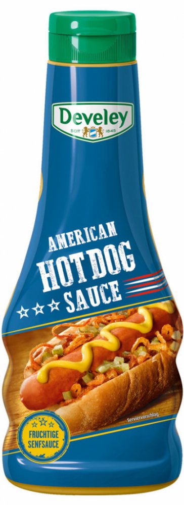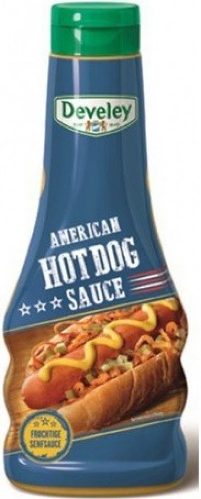 Develey Americká hot dog omáčka, 250ml. Vynikající ovocná Devely - American hot dog sauce omáčka s 30% středně ostrou hořčicí. Develey American hot dog sauce je omáčka pro milovníky párků v rohlíku. Hořčičná omáčka je doplněna lehkými ovocnými tóny manga a jablka. Naše oblíbená omáčka je samozřejmě ideální s párky v rohlíku, ale i kuřecím masem nebo se špízy. Bez přídavku konzervačních látek a och...
