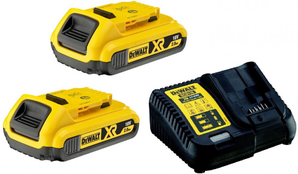 Startovací sada včetně 2 baterií XR 18 V s kapacitou 2,0 Ah a univerzální nabíječky DCB115.
