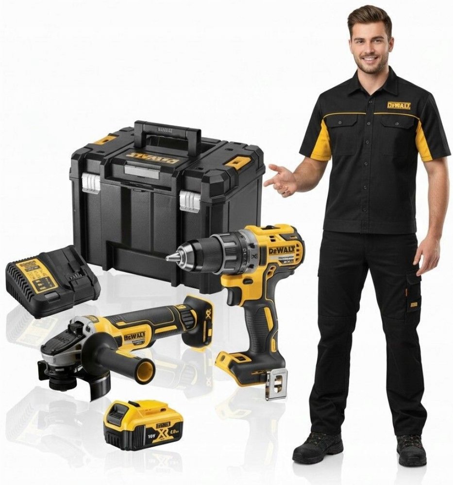 Kombo sada aku nářadí 18V DeWALT DCK2020P2T obsahující vrtačku DCD791, úhlovou brusku DCG405, dva akumulátory 5,0Ah, nabíječku a kufr