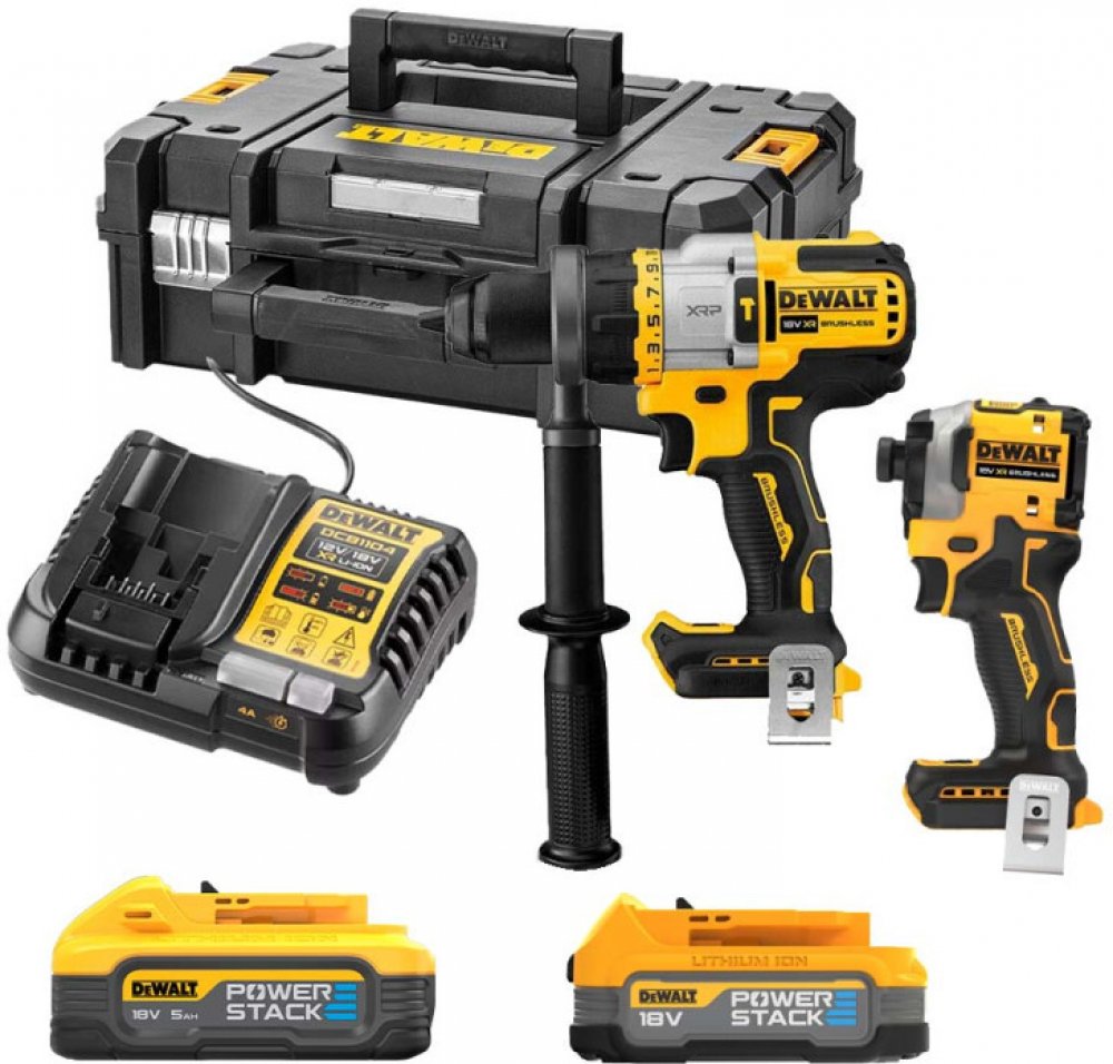Bezuhlíková 2dílná sada Dewalt DCK2052H1E1T 18V XR od ITS obsahuje výkonnou kombi vrtačku spolu s působivě kompaktním příklepovým šroubovákem.