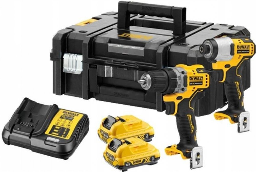Kombo sada aku nářadí 12V DeWALT DCK2110L2T obsahuje vrtačku DCD701, rázový utahovák DCF801, dva akumulátory 3,0 Ah, nabíječku a kufr