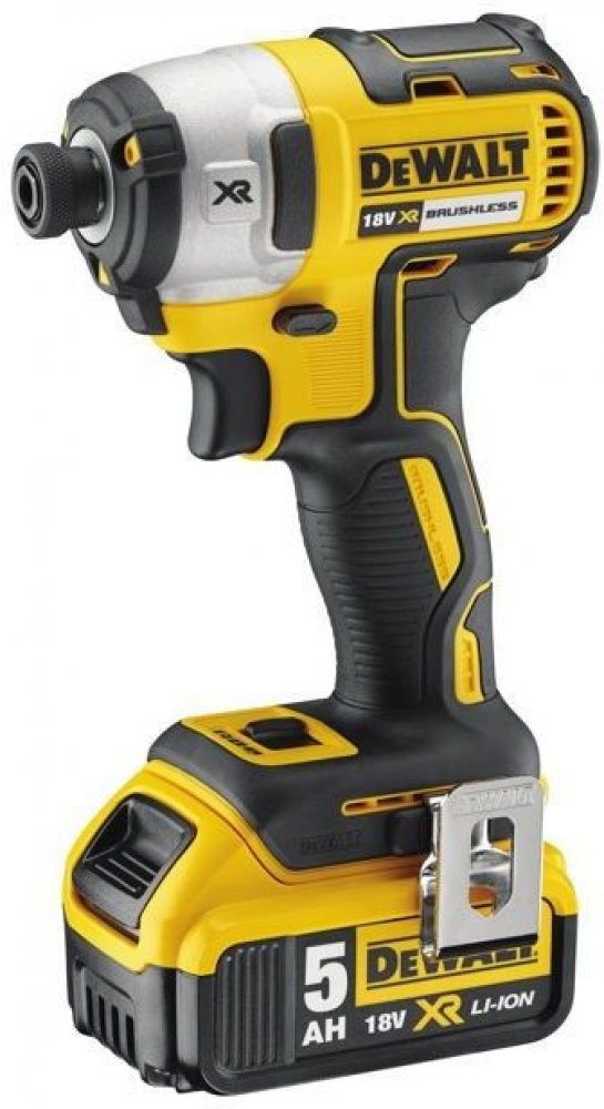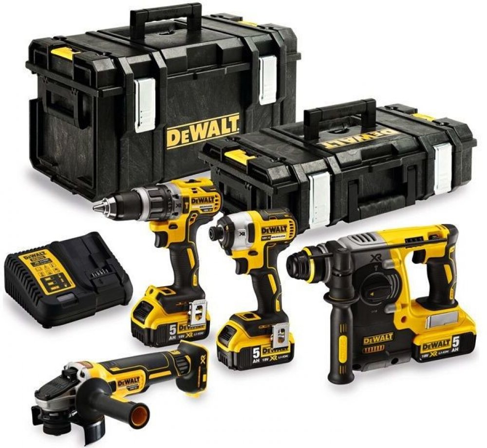 s kladivem DCH273, příklepovou vrtačkou DCD796, úhlovou bruskou DCG405, rázovým utahovákem DCE887, třemi akumulátory 18V 5,0Ah a kufry.