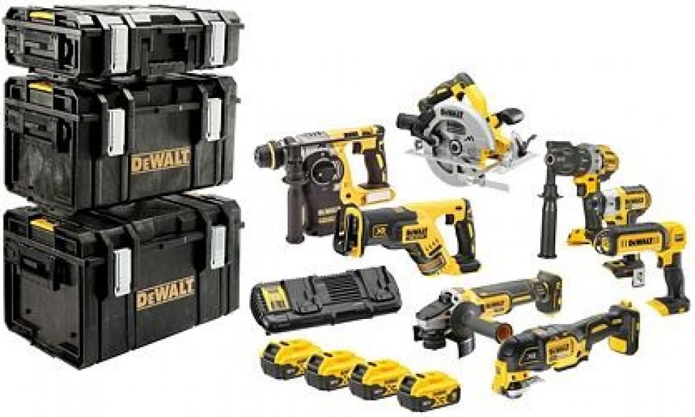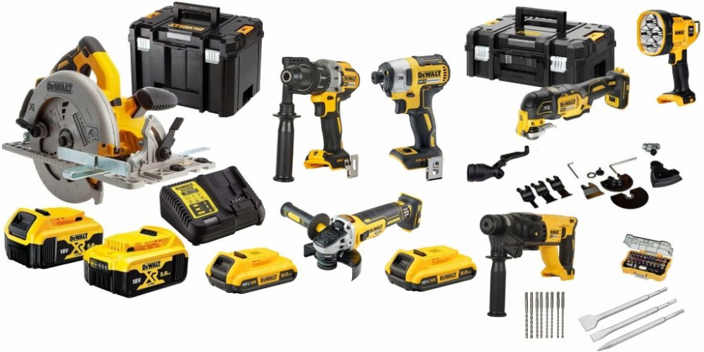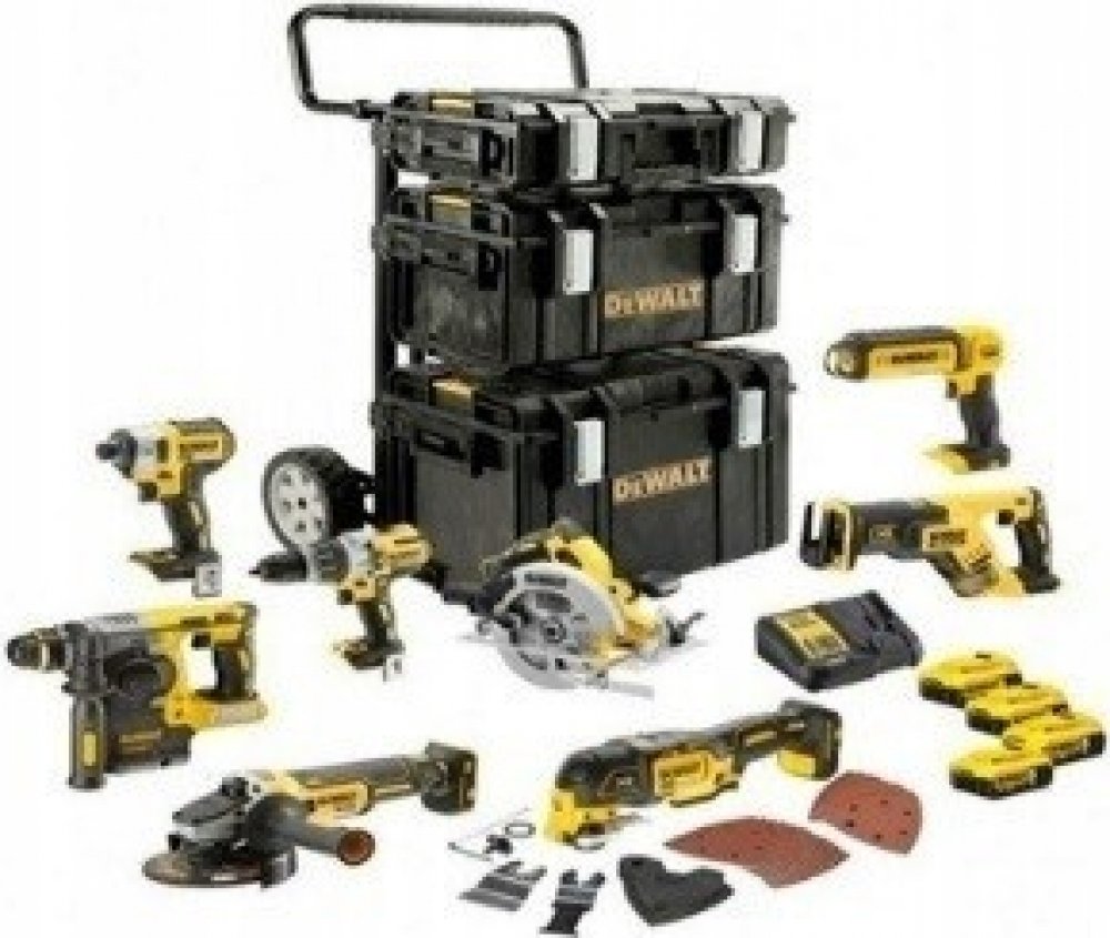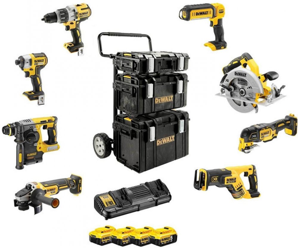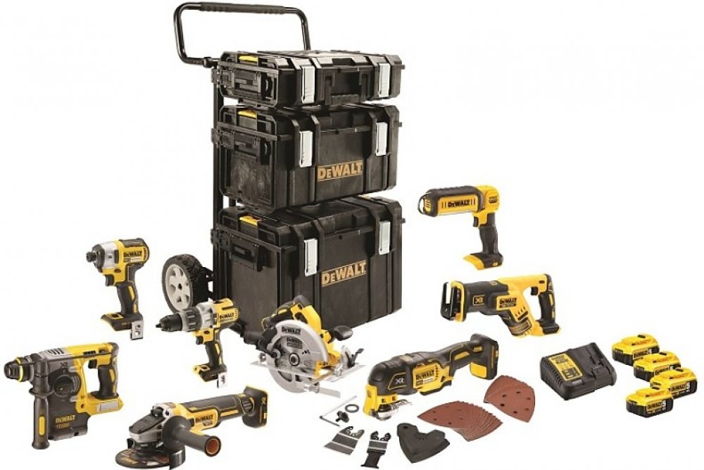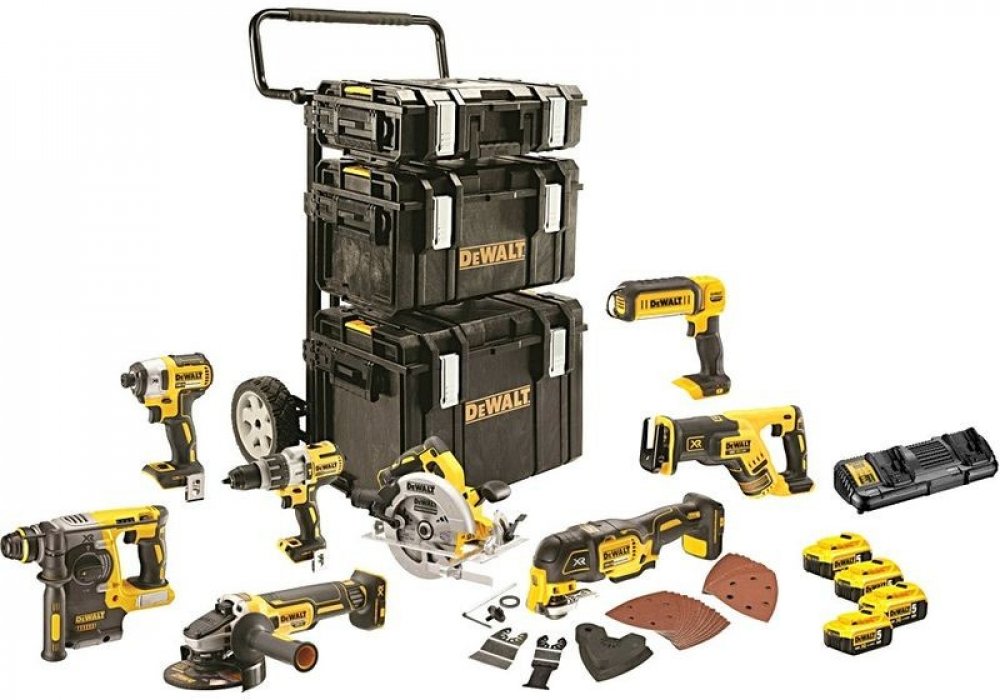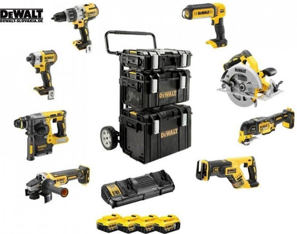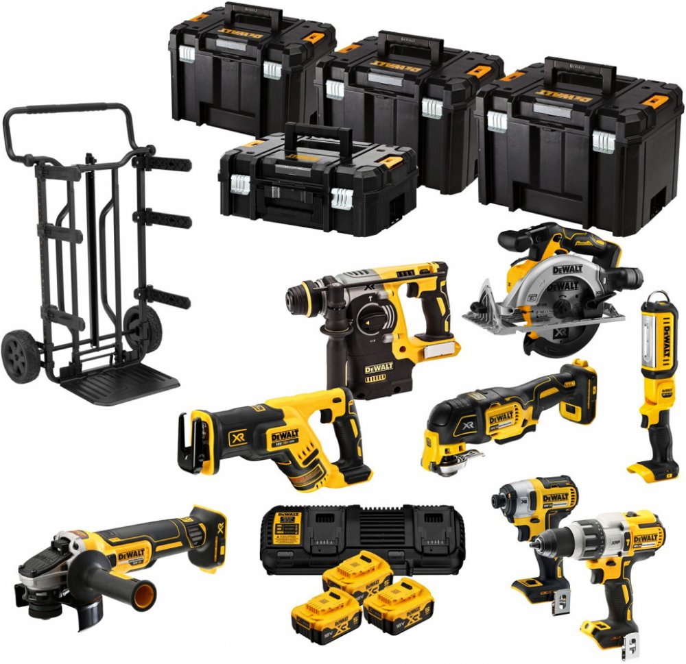 Komplexní aku sada DeWALT strojů uložená v Tough kufrech s vozíkem