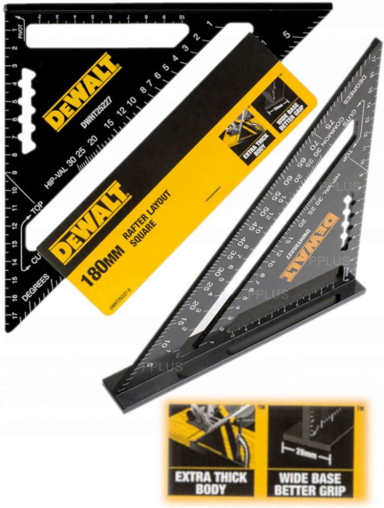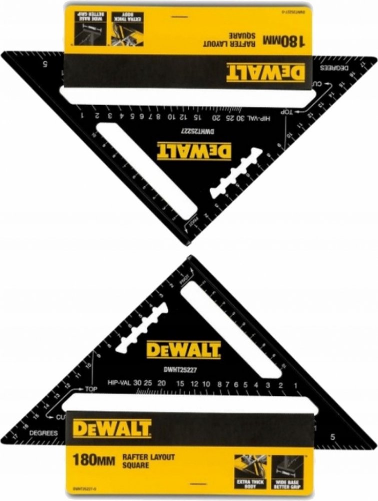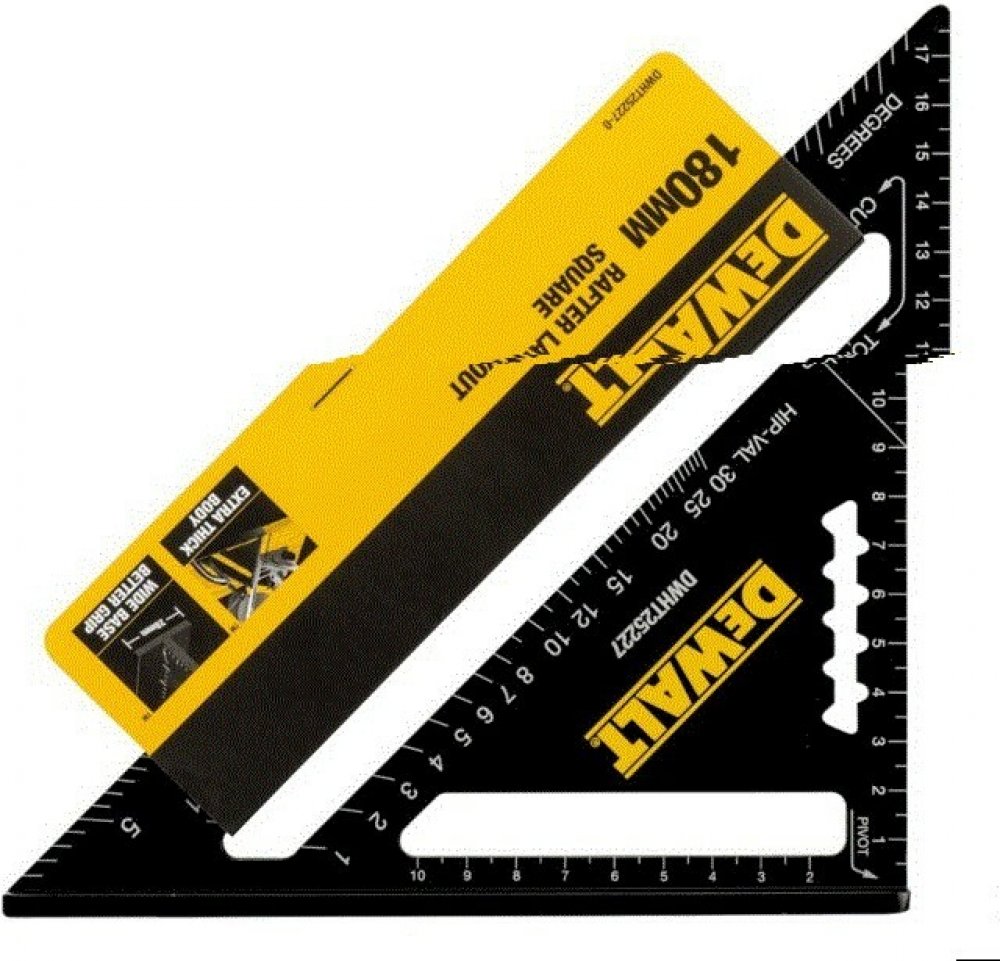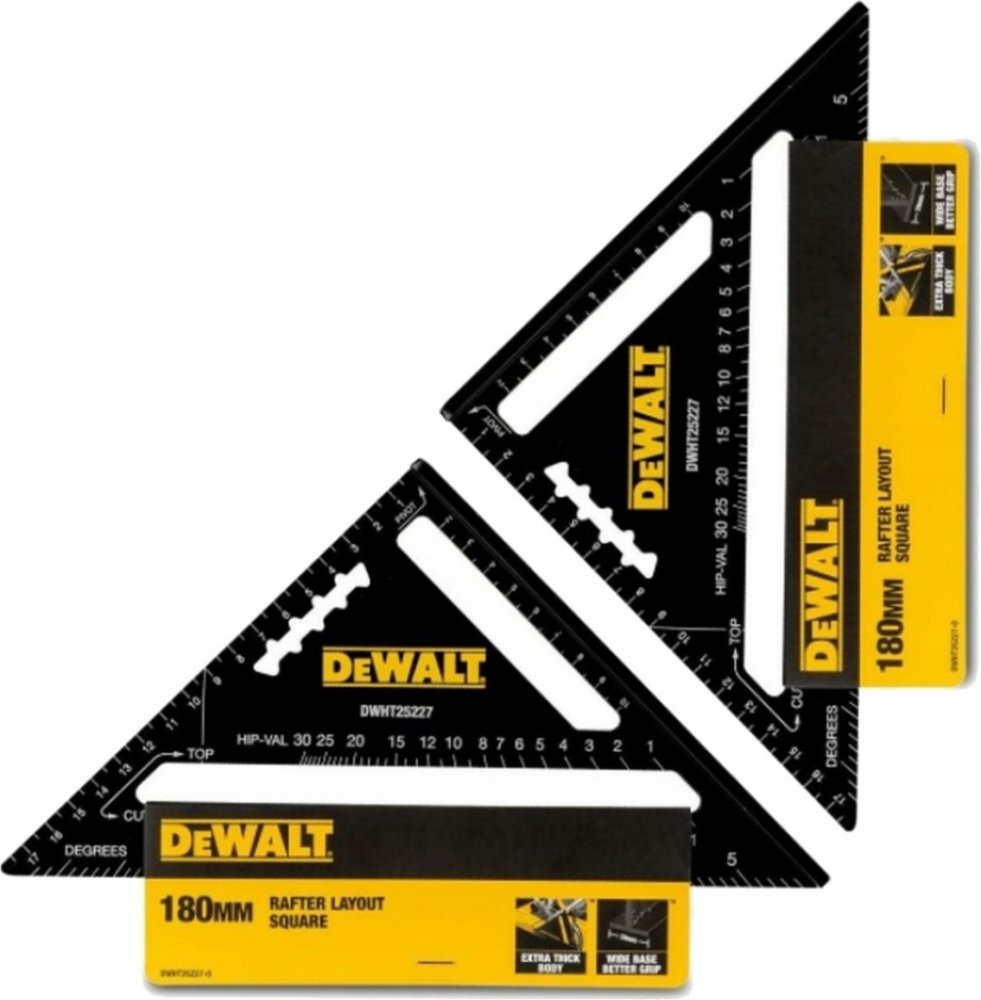 Extra odolný tesařský trojúhelník DeWALT z řady Guaranteed Tough® s metrickým značením. Spodní stupnice využitelná pro měření sklonu krokví a druhá stupnice vhodná na sklon nárožních a úžlabních krokví.