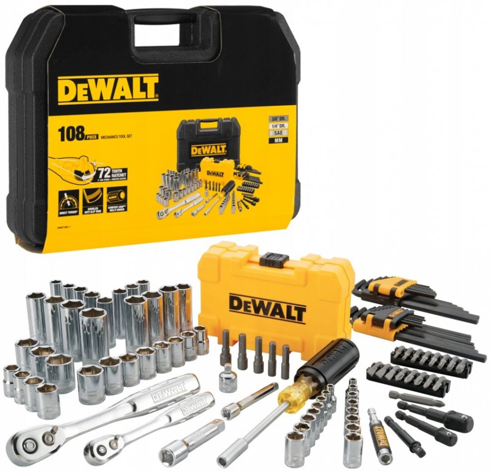 - 1/4" ráčna, 3/8" ráčna, 1/4" prodloužení 75 mm, 3/8" prodloužení 75 mm, redukce z 3/8" na 1/4", 28dílná sada metrických a coulových inbusových klíčů, 1/4" šroubovací rukojeť, 22dílná sada bitů v pouzdře