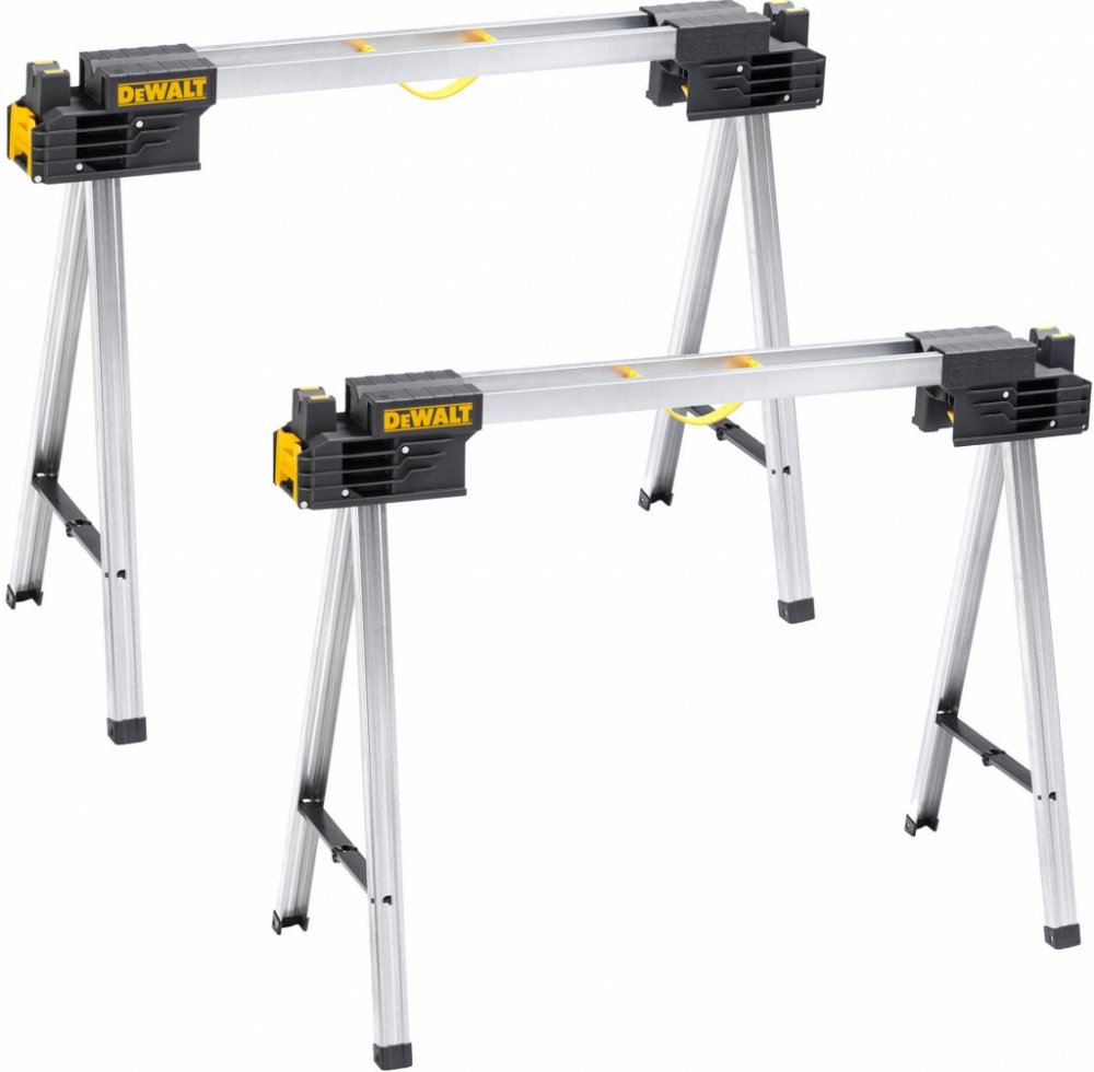Podpěra stavební skládací kovová 2ks DeWALT DWST1-75676 kovový stojan na řezání dřeva vybavený spouštěcími svorkami pro vertikální upínání a V-drážkou pro podporu kulatých profilů na kontaktních plochách s materiálem pryžové podložky pro zvýšení tření při řezání snadno přenosný a sbalitelný, s boční pojistkou proti náhodnému otevření robustní kovové nohy a rám s nosností 900 kg Technické paramet...