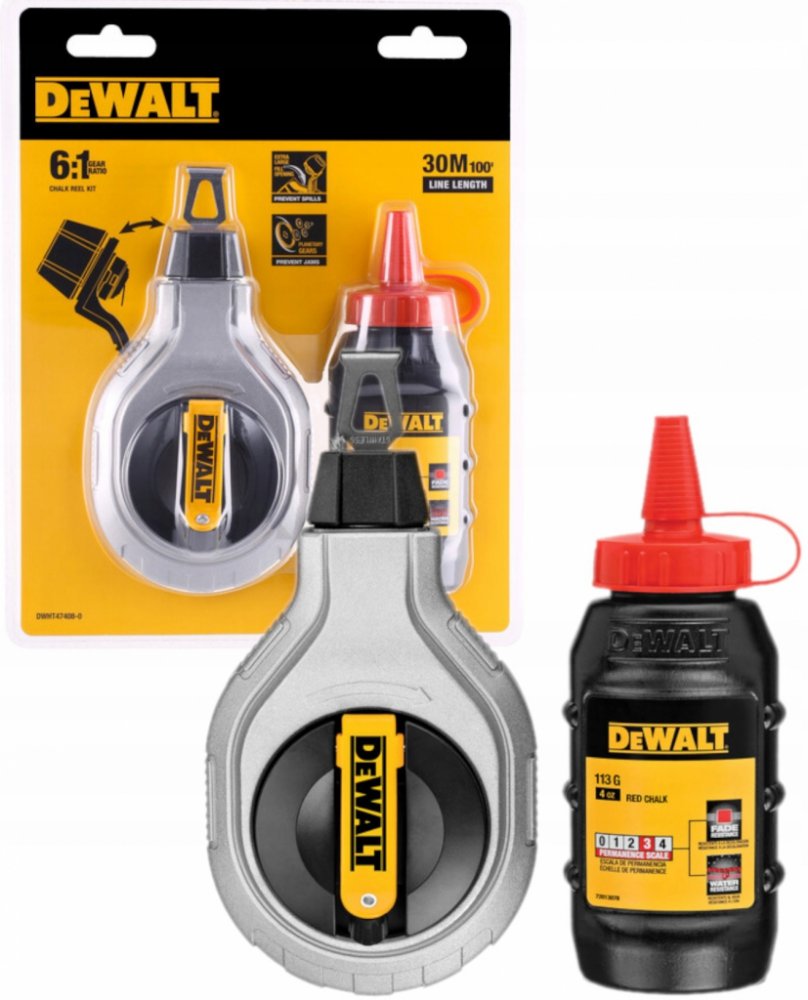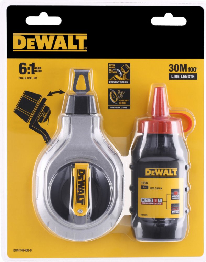 Tato značkovací šňůra 6 : 1 DEWALT® může být používána pro nejrůznější práce od rámování a rozložení stěn až po práce na podlahách a skříních. Tato cívka je vybavena planetovým převodovým systémem, který zabraňuje zablokování, což zaručuje dlouhodobou provozní životnost. Zabraňte rozsypání křídy pomocí velmi velkého sklápěcího víčka pro snadné plnění. Tato cívka je dodávána s nádobkou červené křídy o průměru 110 mm pro větší pohodlí.