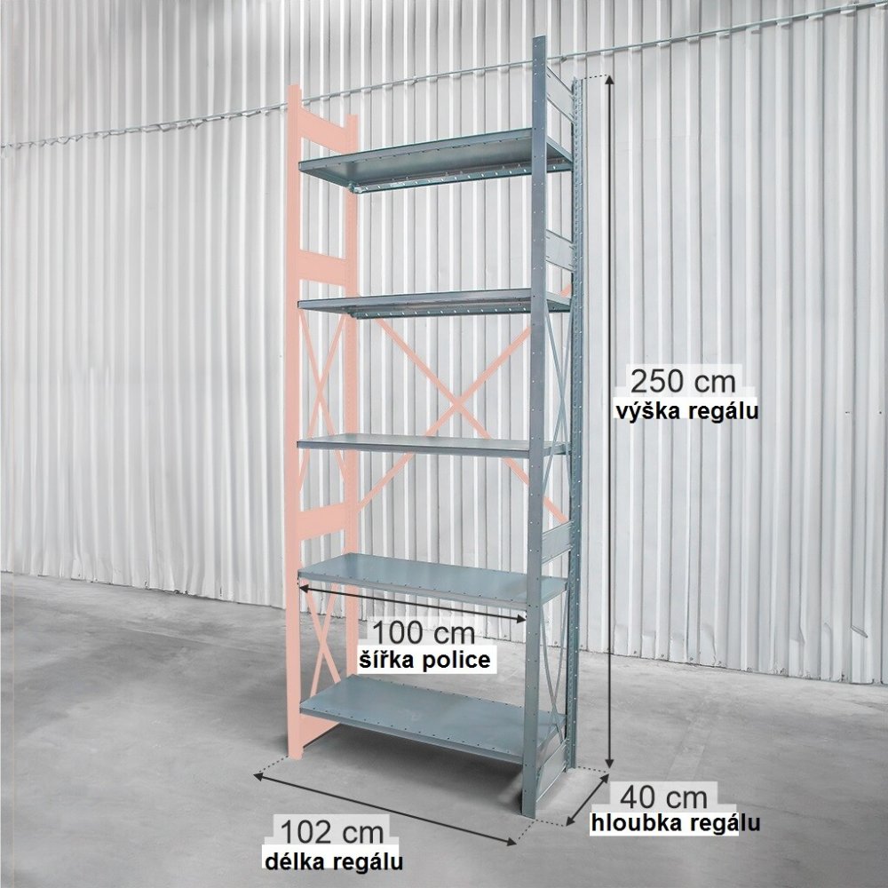 Kovový regál značky DEXION o výšce 250 cm, délce 102 cm a hloubce 40 cm, s rozměry polic 100 × 40 cm. Maximální nosnost jedné police je 100 kg při rovnoměrném rozložení zatížení.