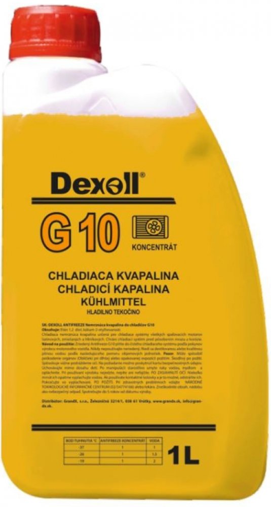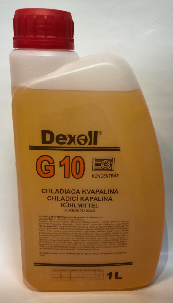 Dexoll Antifreeze G10 Popis: Žlutá nemrznoucí kapalina do chladičů starších automobilů s antikorozními vlastnostmi. Je vhodná pro hliníkové, litinové a smíšené chladící systémy použité v benzínových...