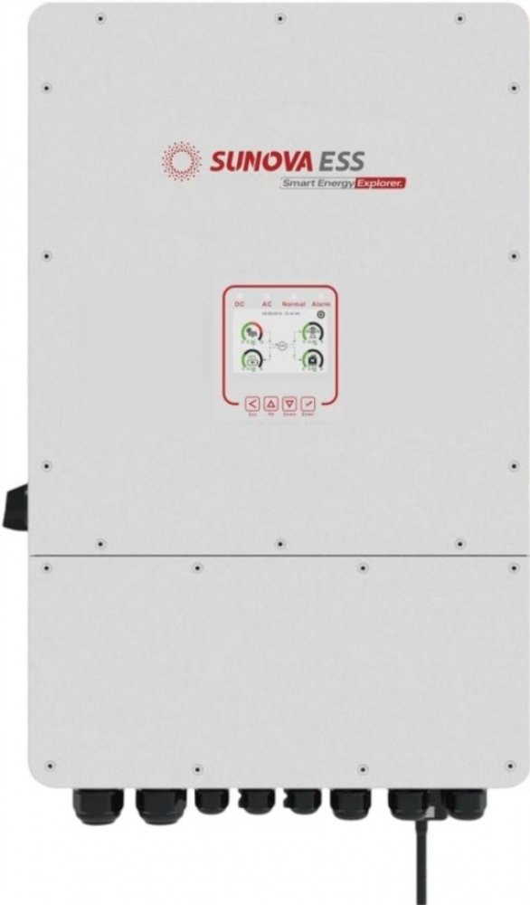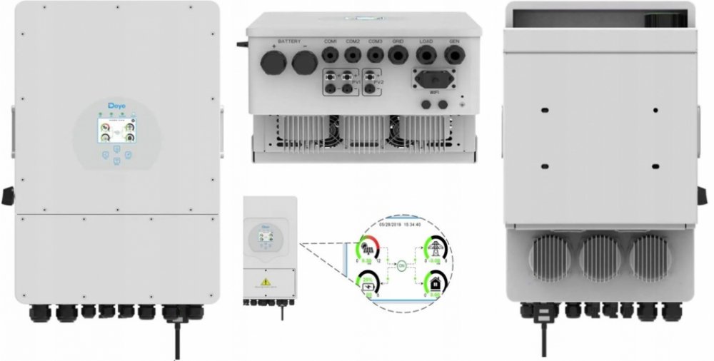 Multifunkční 3fázový asymetrický (150%) hybridní měnič/střídač od výrobce DEYE, který kombinuje funkce měniče, solární nabíječky a nabíječky baterií. Nabízí nepřerušovanou podporu napájení s možností regulace. Komplexní LCD displej zajišťuje uživatelsky konfigurovatelné a snadno dostupné ovládání (nabíjení baterie, AC/solární nabíjení, přípustné vstupní napětí v závislosti na různých aplikacích atd.). Je vybaven portem RS-485/CAN pro komunikaci a správu. Měnič poskytuje další informace, statistiky, grafy + možnost dálkové správy přes dodávaný Wi-Fi dongle. Součástí balení jsou sondy pro měření spotřeby i datalogger. Elektroměr součástí není.