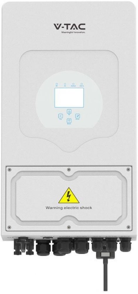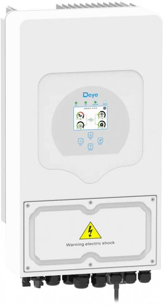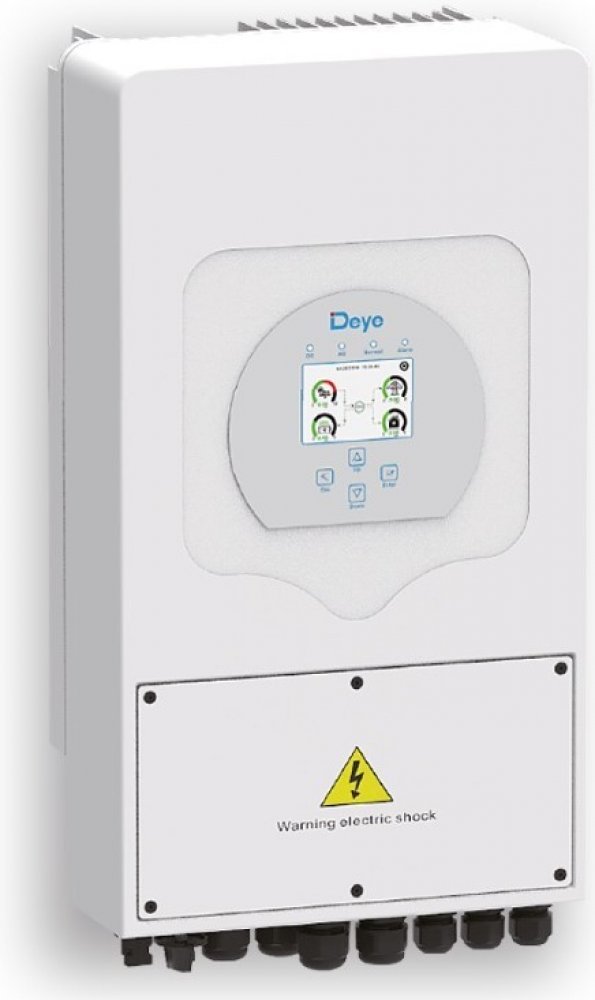 Multifunkční 1fázový hybridní měnič/střídač od výrobce DEYE, který kombinuje funkce měniče, solární nabíječky a nabíječky baterií. Nabízí nepřerušovanou podporu napájení s možností regulace. Komplexní LCD displej zajišťuje uživatelsky konfigurovatelné a snadno dostupné ovládání (nabíjení baterie, AC/solární nabíjení, přípustné vstupní napětí v závislosti na různých aplikacích atd.). Je vybaven portem RS-485/CAN pro komunikaci a správu. Měnič poskytuje další informace, statistiky, grafy + možnost dálkové správy přes dodávaný Wi-Fi dongle. Součástí balení je sonda pro měření spotřeby i datalogger. Elektroměr součástí není.