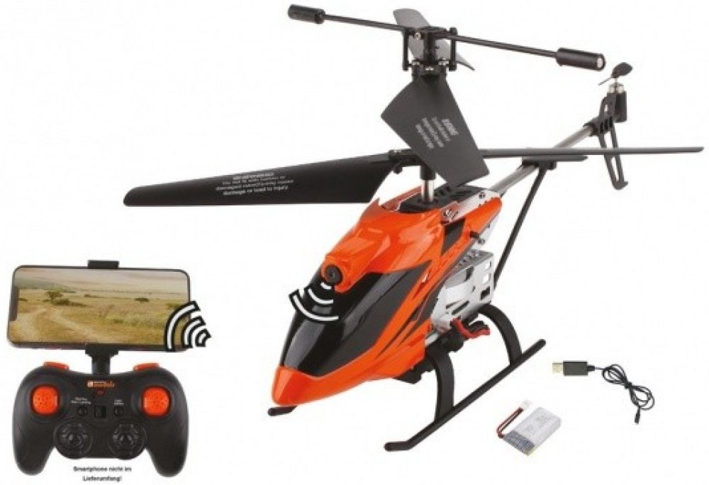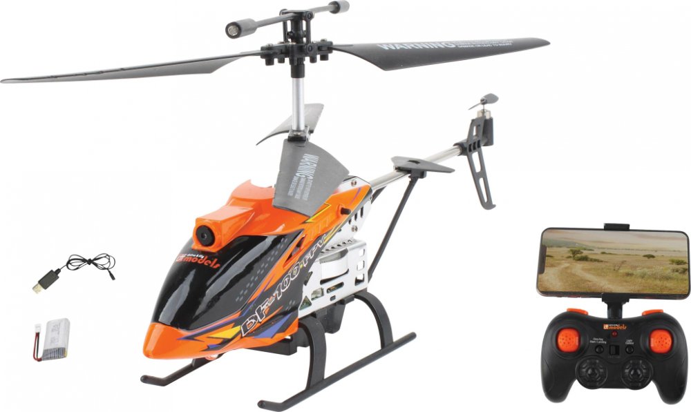 Kvalitní německý výrobce DF Models představil svou novinku v podobě netradičního vrtulníku s kamerou a názvem DF-100 FPV. Jak již prozrazuje název, vrtulníček je osazen HD kamerou s funkcí FPV (first-person view) což znamená, že dokáže přenášet obraz v reálném čase přímo na Váš mobilní telefon. DF-100 je vyrobená s důrazem na letové vlastnosti a také kvalitu, což podtrhuje hliníkové šasi a kabina z pružného odolného plastu. Vrtulník využívá i moderní funkce včetně barometru, model drží nastavenou výšku, nebo třeba AUTO vzlet/přistání. To vše doplňuje LED osvětlením, které oceníte hlavně za ztížených světelných podmínek. Samozřejmostí je ovládání na pásmu 2.4 GHz se 3 kanály. Balení je ve verzi RTF kde najdete kromě baterií do ovladače vše potřebné pro provoz.