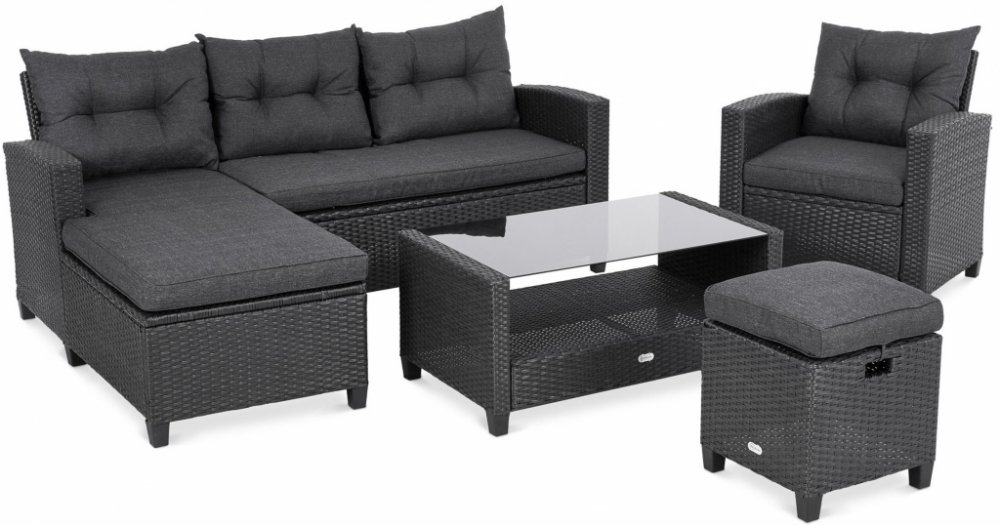 Sedací souprava zahradního nábytku Dalmia je ideální nabídkou pro lidi, kteří oceňují pohodlí, styl a funkčnost při uspořádání venkovních prostor. Sestava sestává ze čtyřmístné rohové sedačky, křesla s područkami, podnožky, kterou lze použít i jako dodatečné sedátko a stolku. Souprava je vyrobena z kvalitního technoratanu v přírodním, béžovém odstínu a je velmi trvanlivá a odolná vůči povětrnostním vlivům. Sedadla a opěrky rohové sedačky a křesla jsou vybaveny měkkými polštáři, které zajišťují pohodlí při sezení. Design nábytku založený na jednoduchosti tvarů a módních, decentních barvách dodává sestavě Dalmia elegantní a moderní vzhled.Odolnost technoratanuKonstrukce nábytku Dalmia kombinuje masivní ocelový rám a výplet z technorattanu, který se vyznačuje přirozeným vzhledem a odolností vůči nepříznivým vlivům vlhkosti, UV záření a změnám teplot. Tento výběr materiálů činí zahradní nábytek odolným a velmi odolným, takže léty používání neztrácí své vlastnosti a estetický vzhled. Výhodou zahradního nábytku z technoratanu je absence potřeby sezónní údržby a snadná péče.Pohodlné polštářePro maximální pohodlí při používání je nábytek Dalmia vybaven pohodlnými polštáři na sedadlech a opěradlech. Vícevrstvá výplň polštáře je měkká a zároveň odolná vůči deformaci. Barva polštářů je sladěna s barvou výpletu z technoratanu, což zajišťuje estetický a harmonický vzhled celé sady. Díky impregnaci zůstane látka povlečení na polštáře déle čistá a svěží. Povlaky na polštáře mají také zip, který umožňuje jejich vyjmutí na praní.Praktický stolekObdélníkový kávový stolek s přídavnou policí pod deskou je praktickým kusem nábytku, který vám umožní podávat občerstvení a nápoje a pohodlně ukládat příslušenství. Deska stolu z tvrzeného černého skla, odolná vůči vodě a snadno se udržuje v čistotě. Jeho hladký povrch neabsorbuje nečistoty, díky čemuž se snadno udržuje v čistotě. Konstrukce stolu je vyrobena ze stejných materiálů jako ostatní prvky sestavy, díky čemuž sestava působí velmi uceleně.