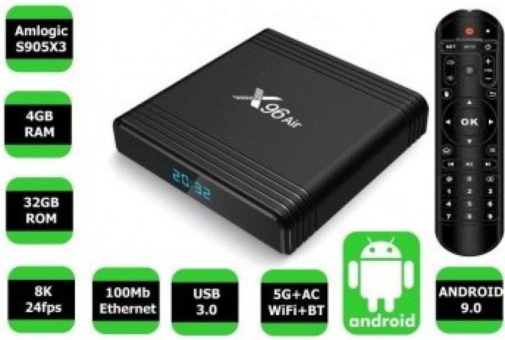 Procesor Amlogic S905X3 64bitový čtyřjádrový procesor ARM® Cortex ™ A55 C GPU Procesor GPU G31 ™ MP2 RAM aměť 4 GB DDR3 Flash paměť 32 GB eMMC Wi-Fi 2.4 GHz / 5 GHz, IEEE 802.11 ac / b / g / n / AC Bluetooth v4.1 Připojení 1 x HDMI výstup 2.1 (podpora HDMI CEC, dynamický výstup HDR a 8Kx4K) 1 x AV výstup jack 3.5 mm (480i / 576i) 1 x USB 3.0; 2 x USB 2.0 1 x IR Přijímač dálkového ovládání 1 x RJ45 Gigabit ethernetové rozhraní; podpora 1000Mbits 1 x S/PDIF digitální optický audio výstup zvuku 1 x TF čtečka karet (podpora 4/8/16/32/64 GB) Napájení DC 5V / 2A Příkon 6 Watt Software OS Android 9.0 Video Amlogic Video Engine (AVE) s vyhrazenými hardwarovými dekodéry a snímači