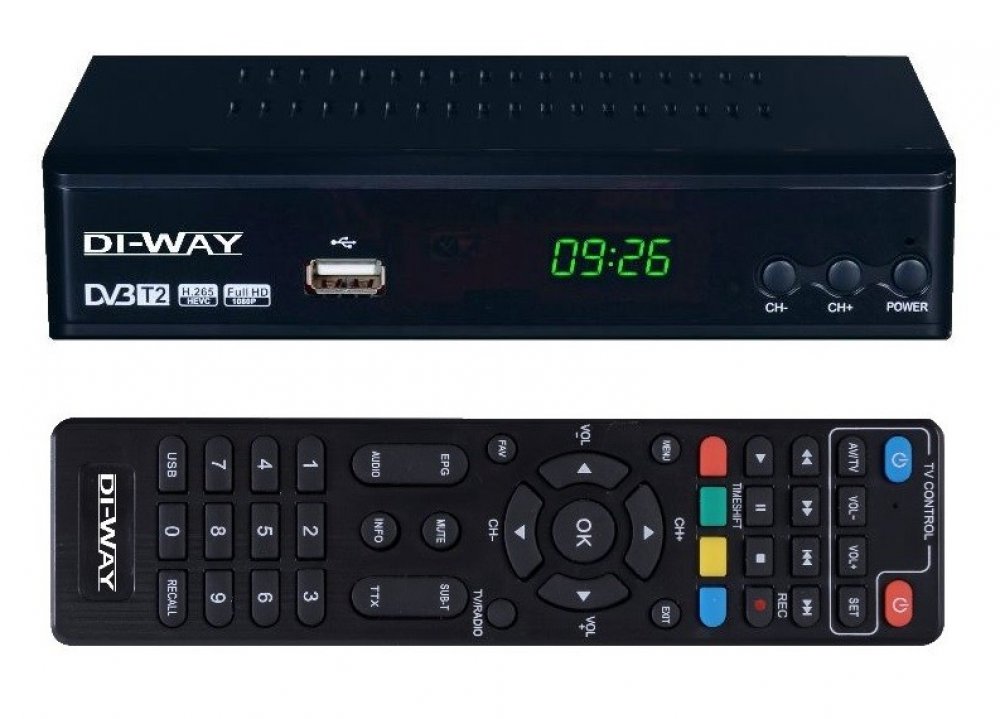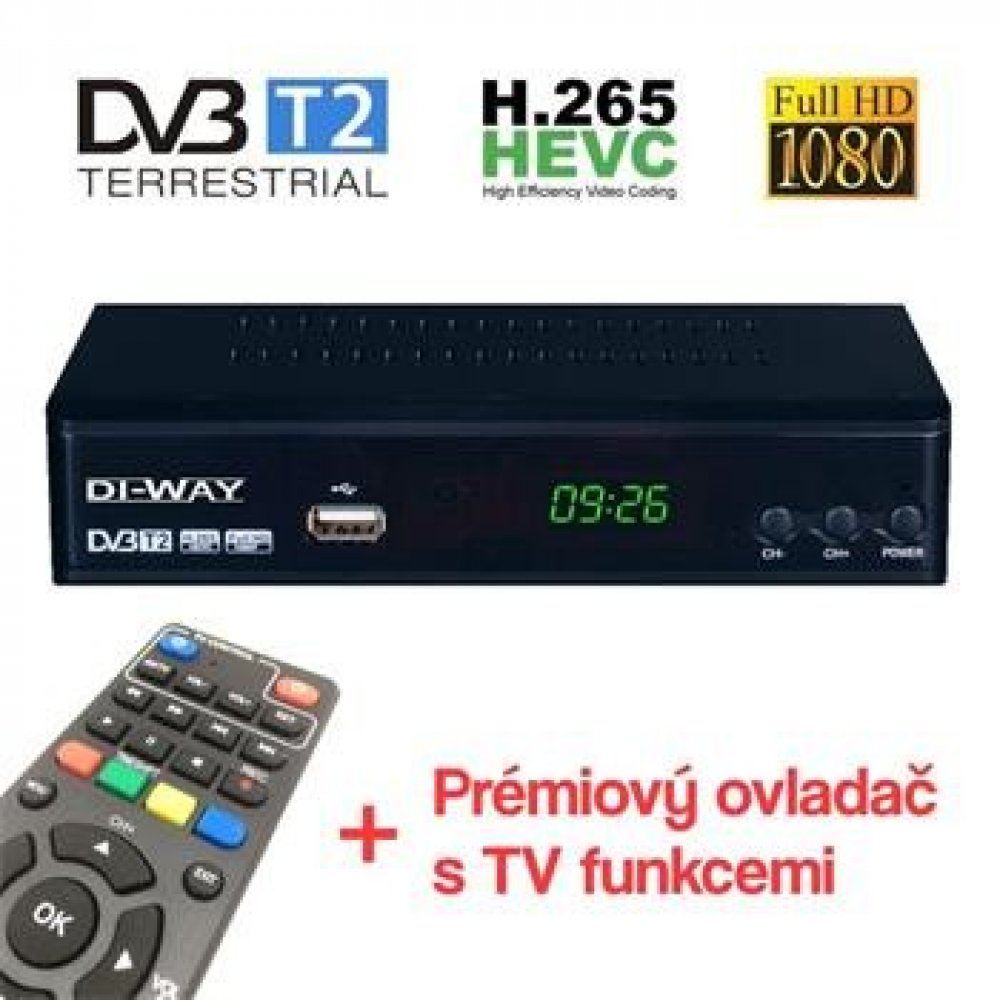 digitální 1 x 1 HDMI, SCART, USB, Koax DI-WAY Přijímač, dálkový ovladač, HDMI kabel, napájecí adaptér, návod černá barva 1000 DVB-T2. H.265/HEVC