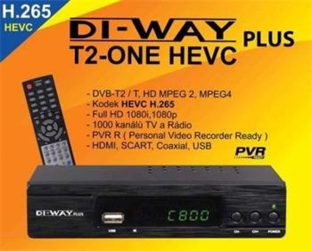 1 x scart 1 x 1 1× HDMI 1.3, 1× SCART, 1× USB 2.0 DI-WAY Dálkový ovladač, adaptér, HDMI kabel, návod, DI-WAY T2-ONE plus DVB-T2. H.265/HEVC 0.5 kg