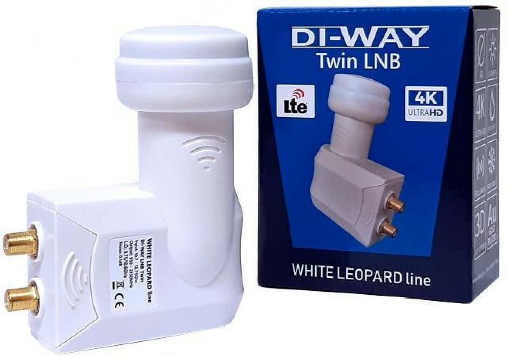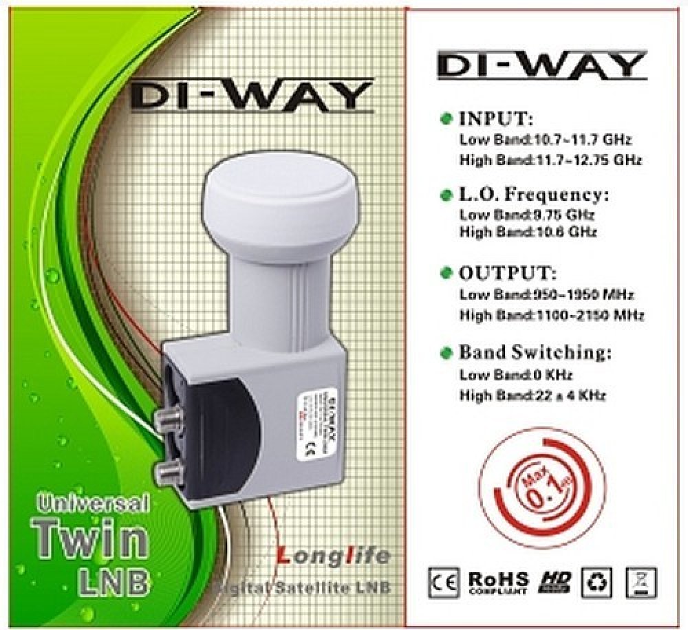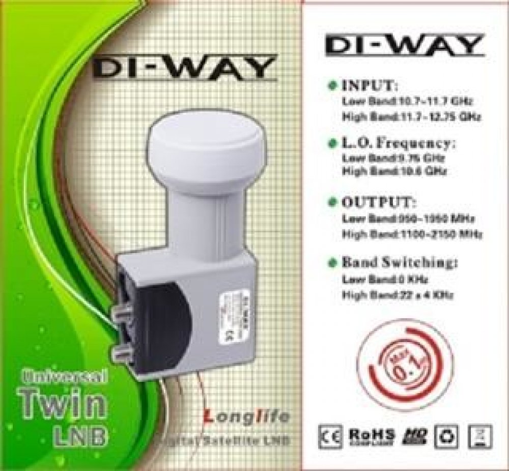 DI-WAY Twin je univerzální LNB konvertor s šumovým číslem 0,1 dB, který Vám zajistí příjem z 1 družice až pro 2 účastníky ( televizory ). K tomuto LNB konvertoru je možné připojit až 2 satelitní přijímače, nebo jeden dvou tunerový satelitní přijímač.