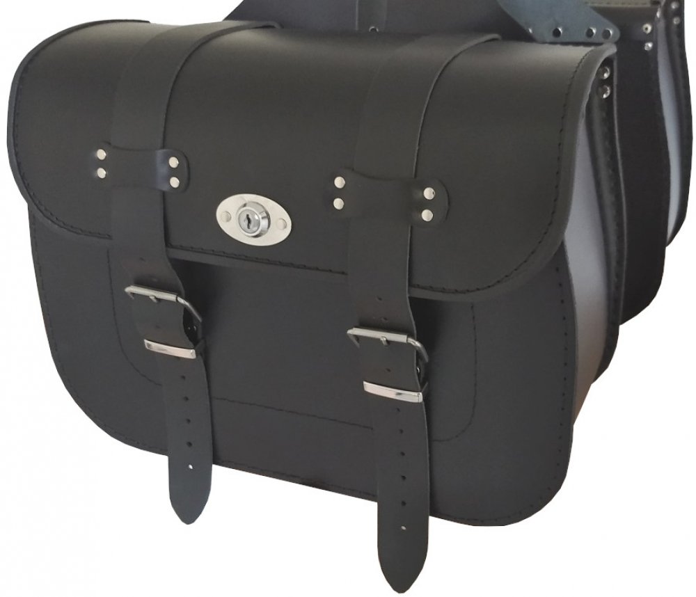 Diablo Moto boční kožené brašny, motobrašny na motocykloblíbený tvar brašen na motorku typu chopper- uvedená cena je za pár brašen- materiál: hovězí kůže 2,2 mm silná + plast 2 mm- odolné, pevné - brašny dobře drží tvar- brašny mají na všech plochách výztuhu z 2 mm plastu- nastavitelný středový popruh dle šířky motocyklu- rozměr(DxVxH): 43 x 32 x 18 cm - objem: 2 x 19 litrůKůži je nutné chránit pr...