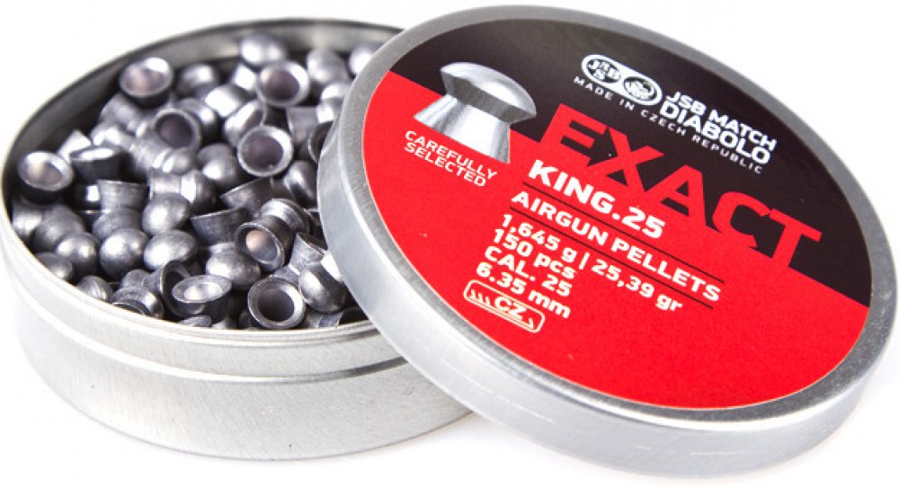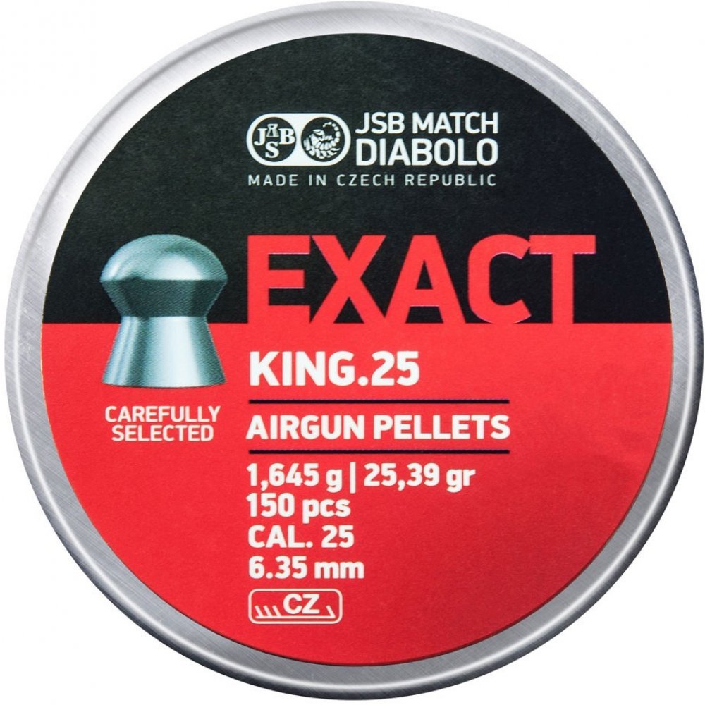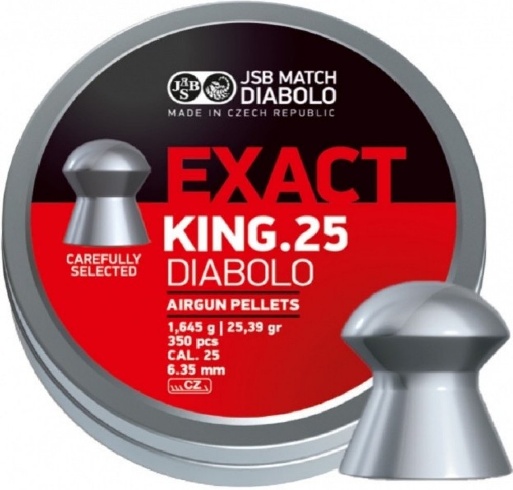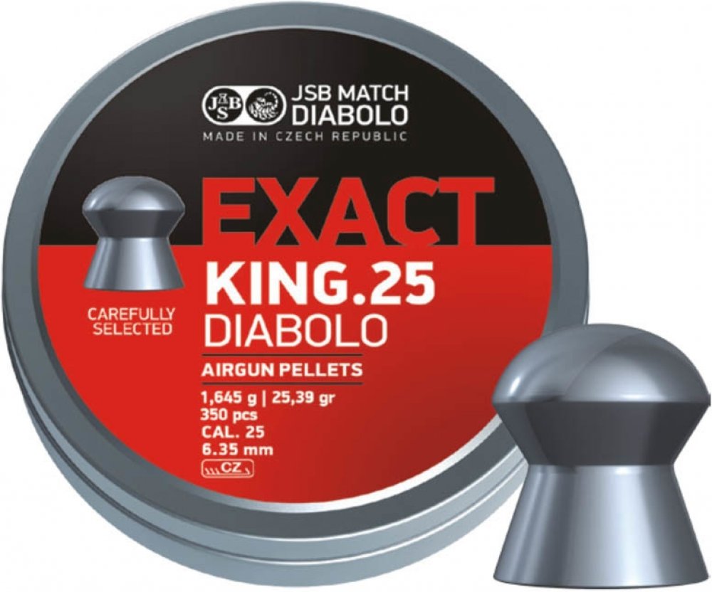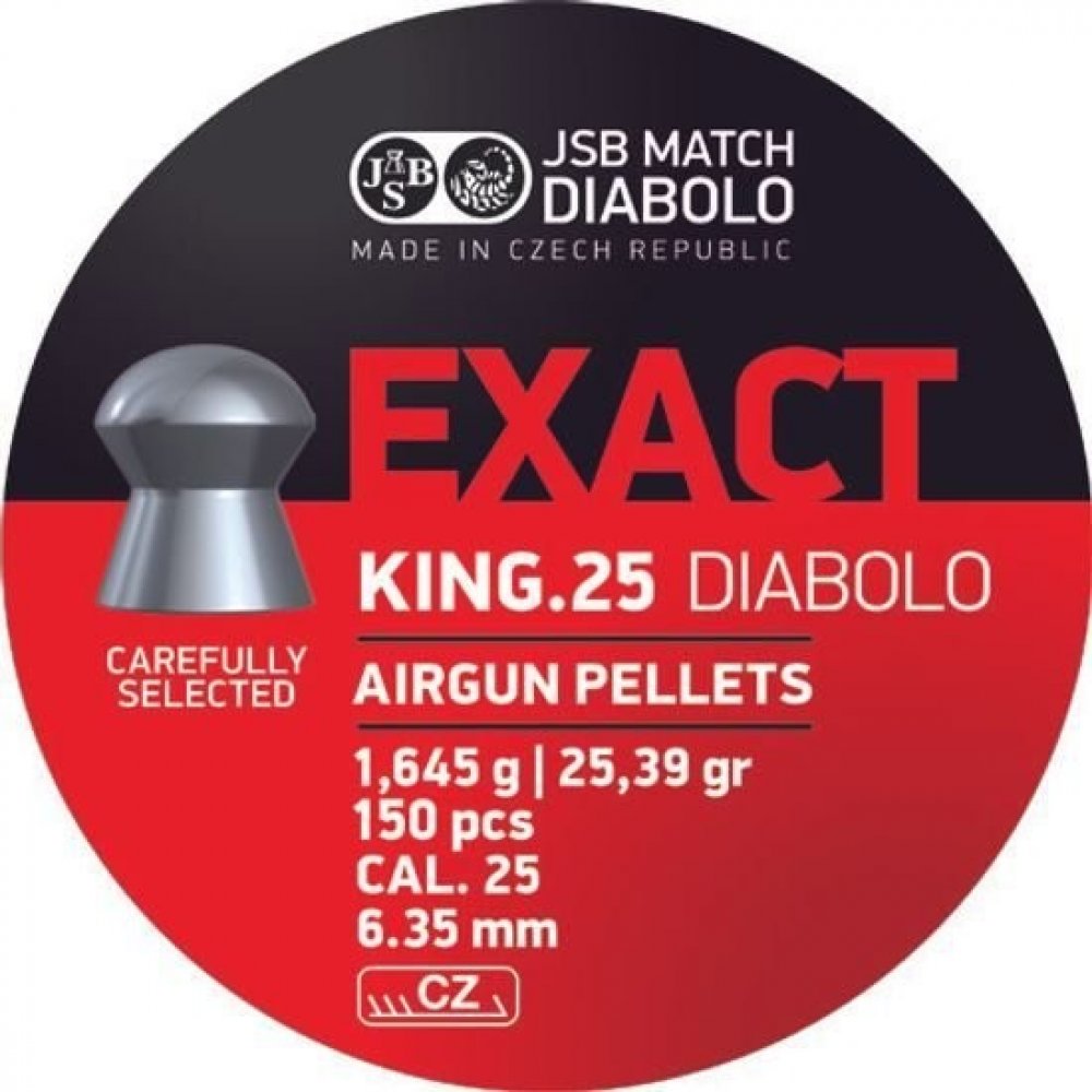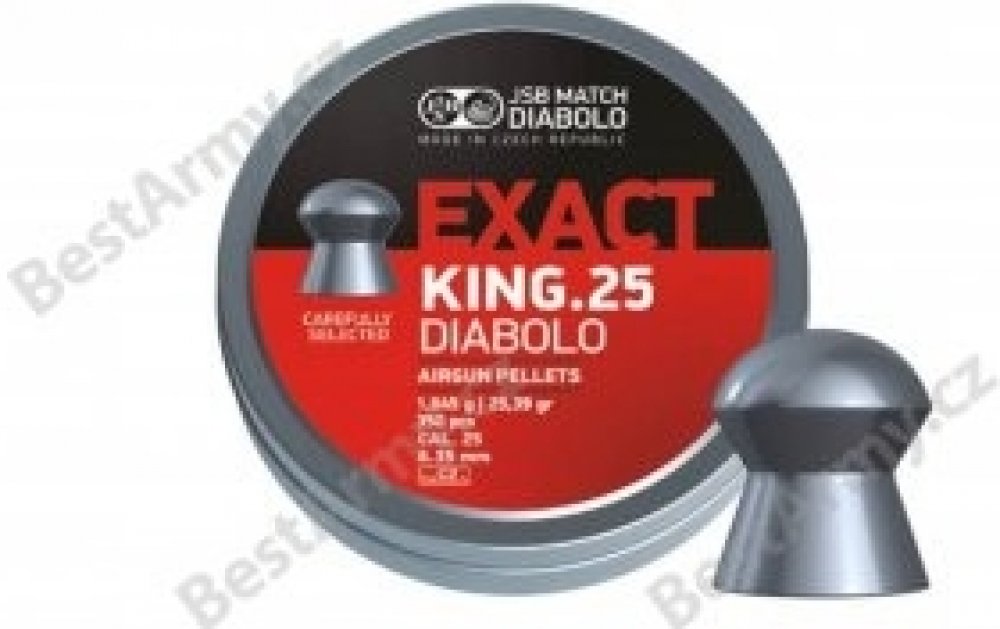 Diabolky Exact King 6.35 mm JSB® / 150 ks jsou první diabolky firmy JSB® v kalibru .25 (6,35 mm). Diabolky jsou speciálně designovány a precizně zpracovány tak, aby dosahovaly maximální přesnosti při střelbě. Zárukou kvality je přísná ruční výstupní kontrola kvality. Díky ideální hmotnosti je diabolka univerzální pro téměř všechny vzduchové pušky odpovídající ráže. Ráže je v ČR omezena vlastnictvím zbrojního průkazu.