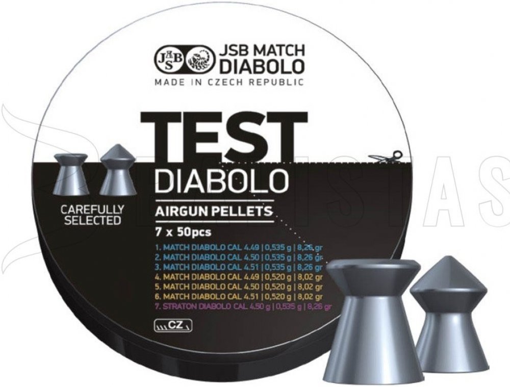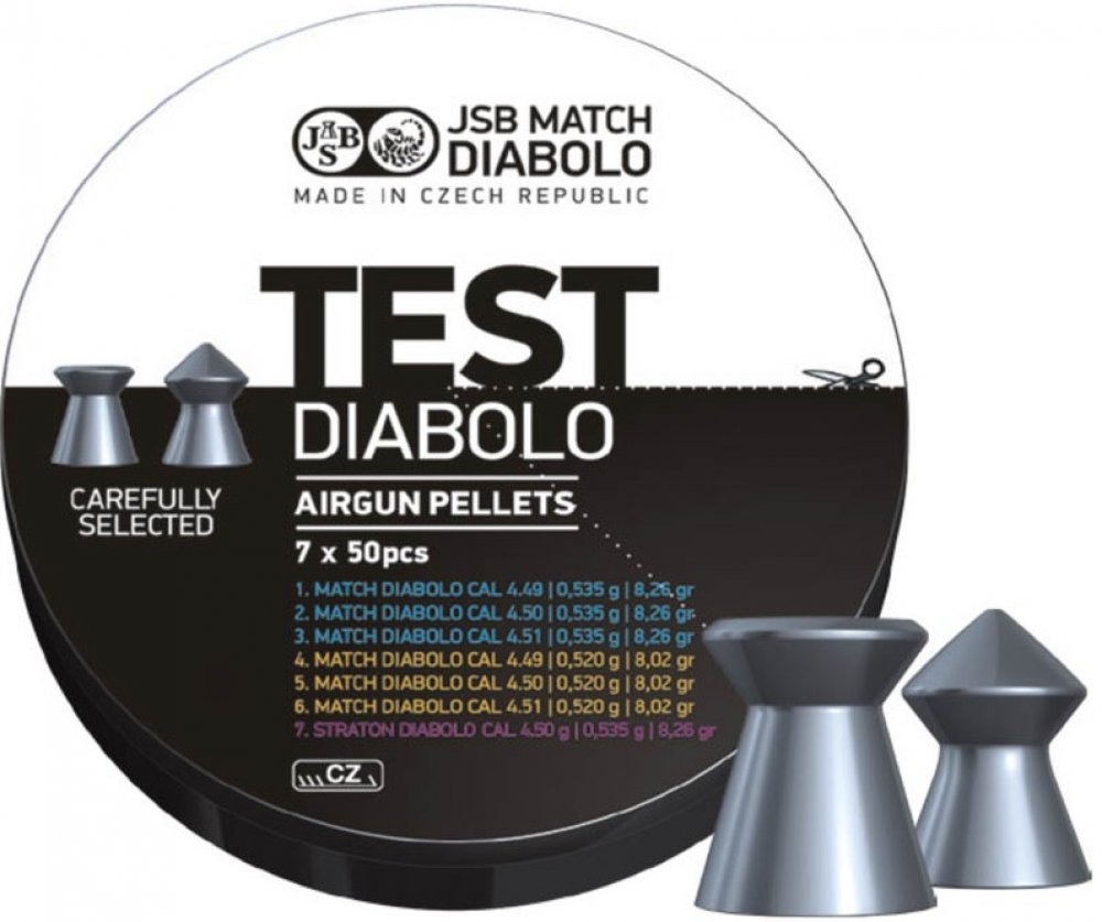Jde o balení diabolek JSB Match Middle Weight ideální pro vyzkoušení střeliva u nové zbraně. U diabolek ve verzi Test vám výrobce nabízí 7 různých druhů diabolek lišících se jak gramáží, tak i ráží. Každý druh přitom má 50 zástupců. Celkem tedy obdržíte 350 ks diabolek určených pro ráži 4,5 mm.
