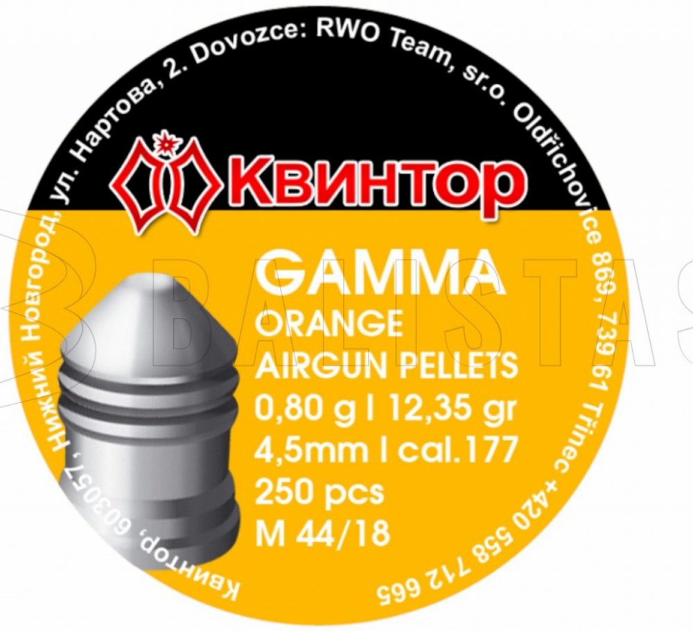 Diabolo Kvintor Gamma Orange 4,5mm 250ks. Diabolky Kvintor Gamma Orange jsou navrženy pro destrukční střelbu na dlouhou vzdálenost. Speciální tvar půlkulaté hlavičky s dutinou zvyšuje expanzi diabolky při dopadu.