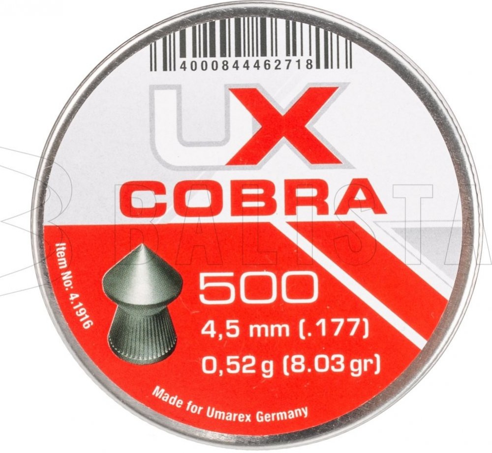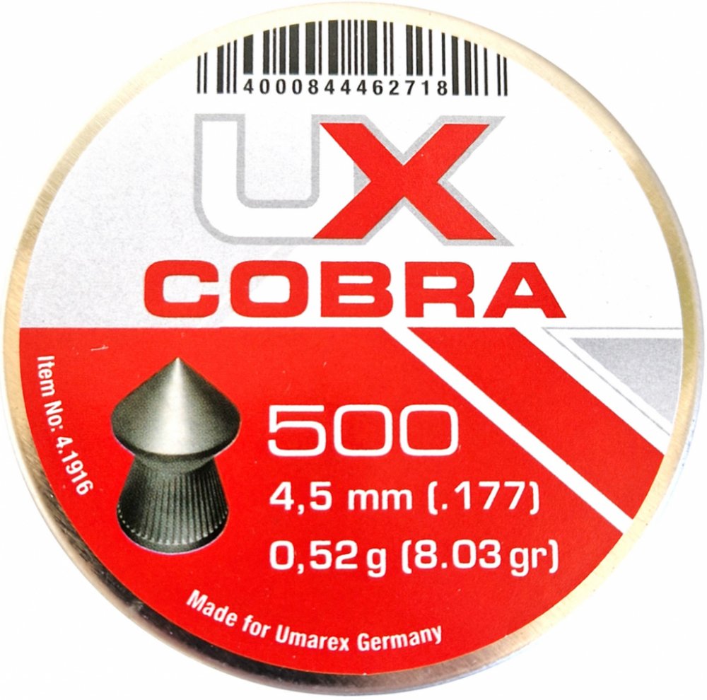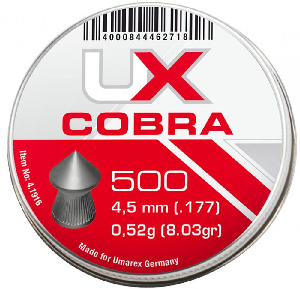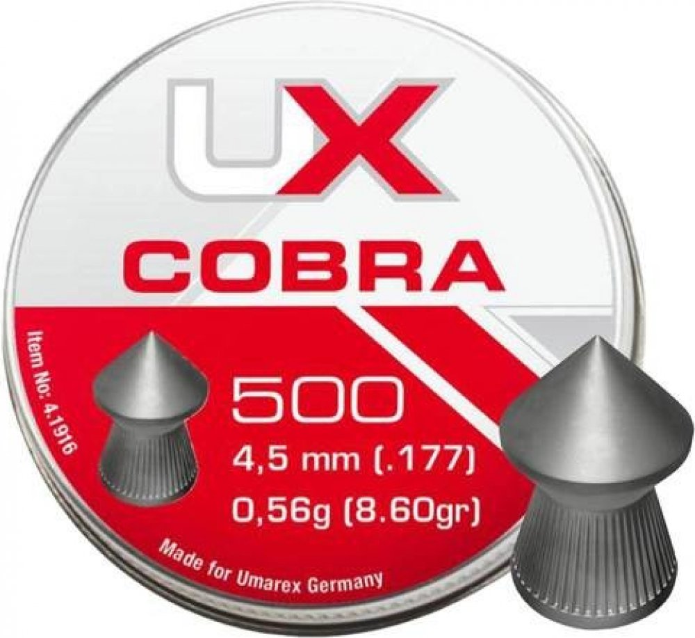 Sada diabolek Cobra ráže 4.5 mm jsou vyráběná firmou UMAREX, která je známá precizním a kvalitním zpracováním svých produktů. Tento typ diabolek disponuje špičkou s drážkami po obvodu a tím je zaručena bezproblémová průchodnost cílem. Diabolky jsou charakteristické vysokou přesností a kvalitou. Hmotnost: 0,52 g Balení: 500 ks