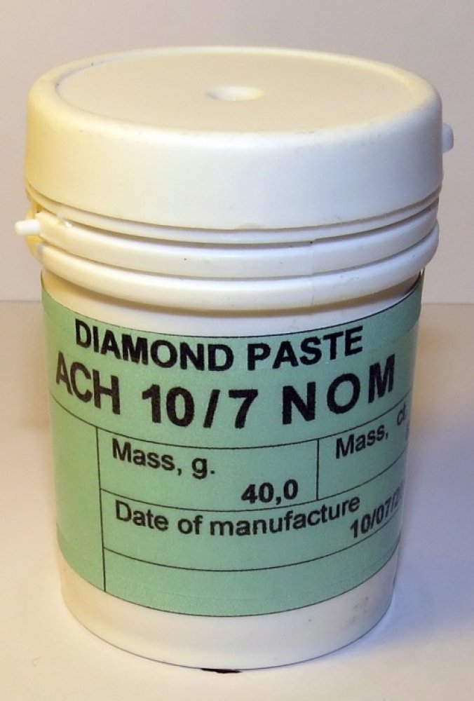 Zrnitost diamantové pasty: 125/100; 100/80; 80/63; 60/40; 40/28; 28/20; 20/14; 14/10; 10/7; 7/5; 5/3; 3/2; 2/1; 1/0; 0,5/0