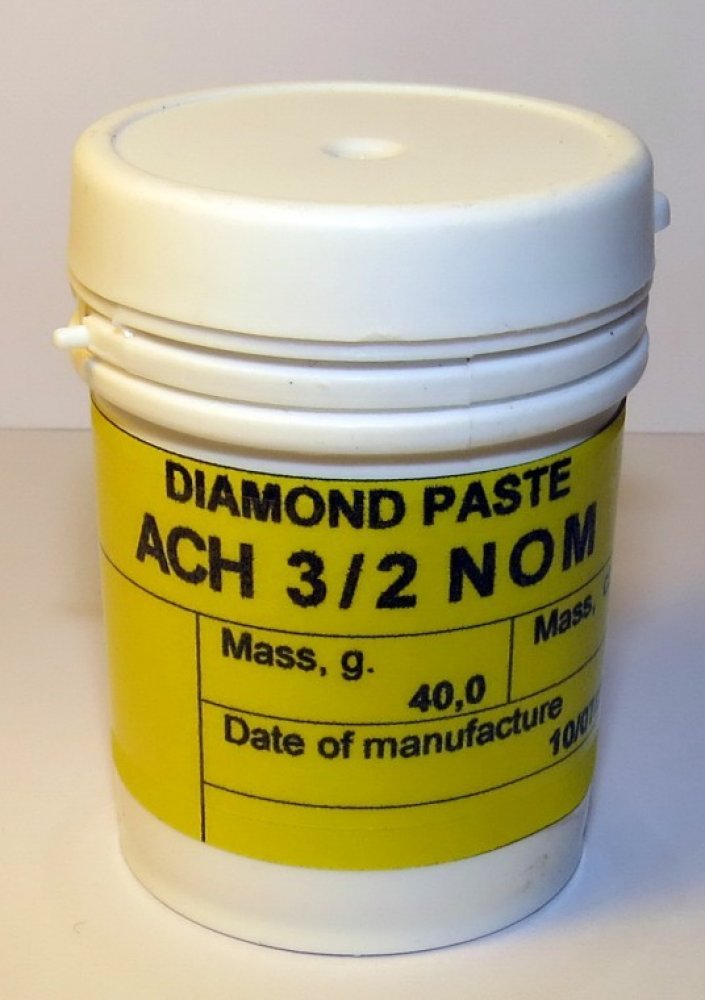 Zrnitost diamantové pasty: 125/100; 100/80; 80/63; 60/40; 40/28; 28/20; 20/14; 14/10; 10/7; 7/5; 5/3; 3/2; 2/1; 1/0; 0,5/0