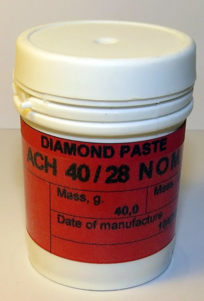 Zrnitost diamantové pasty: 125/100; 100/80; 80/63; 60/40; 40/28; 28/20; 20/14; 14/10; 10/7; 7/5; 5/3; 3/2; 2/1; 1/0; 0,5/0