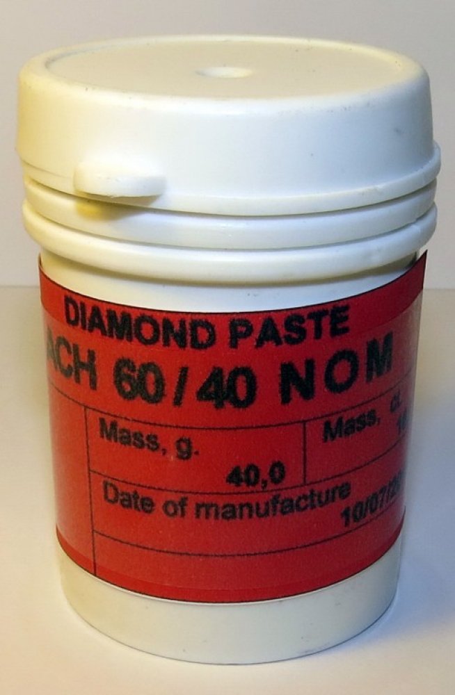 Zrnitost diamantové pasty: 125/100; 100/80; 80/63; 60/40; 40/28; 28/20; 20/14; 14/10; 10/7; 7/5; 5/3; 3/2; 2/1; 1/0; 0,5/0