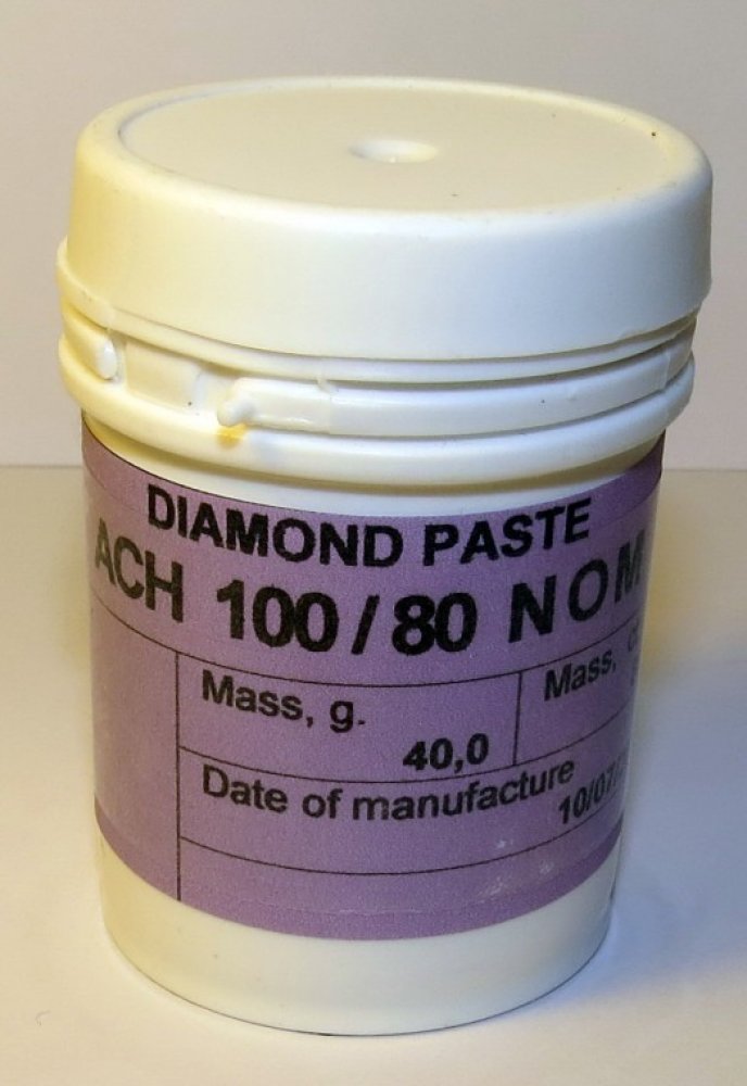 Zrnitost diamantové pasty: 125/100; 100/80; 80/63; 60/40; 40/28; 28/20; 20/14; 14/10; 10/7; 7/5; 5/3; 3/2; 2/1; 1/0; 0,5/0